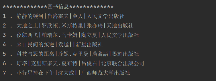 book_list = [['静静的顿河','肖洛霍夫','金人', '人民文学出版社'], ['大地之上','罗欣顿.米斯特里','张亦琦', '天地出版社'], ['夜航西飞', '柏瑞尔.马卡姆', '陶立夏', '人民文学出版社'], ['来自民间的叛逆', '袁越', '','新星出版社'], ['科技与恶的距离', '珍妮.克里曼', '詹蕎語', '墨刻出版社'], ['灯塔','克里斯多夫.夏布特','吕俊君','北京联合出版公司'], ['小行星掉在下午','沈大成', '', '广西师范大学出版社']] title='图书信息' print(title.center(30,'*')) i=0 while i <len(book_list): print(i+1,'.','|'.join(book_list[i])) i+=1