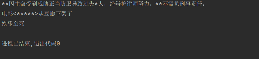 words_sensitive_list = ['张三', 'V字仇杀队', '杀'] comments_list = ['张三因生命受到威胁正当防卫导致过失杀人,经辩护律师努力,张三不需负刑事责任。', '电影<V字仇杀队>从豆瓣下架了', '娱乐至死'] t=0 while t < len(words_sensitive_list): i=0 while i < len(words_sensitive_list): comments_list[t]=comments_list[t].replace(words_sensitive_list[i],'*'*len(words_sensitive_list[i])) i+=1 t+=1 print('\n'.join(comments_list))