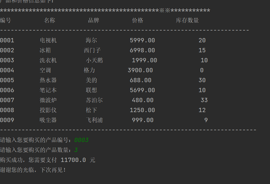 """ 家用电器销售系统 v1.1 """ #欢迎信息 print('欢迎使用家用电器销售系统!') #产品信息列表 print('产品和价格信息如下:') print('********************************************※※***********') print('%-10s'%'编号','%-10s'%'名称','%-10s'%'品牌','%-10s'%'价格','%-10s'%'库存数量') print('---------------------------------------------------------------------') print('%-10s'%'0001','%-10s'%'电视机','%-10s'%'海尔','%-10.2f'%5999.00,'%10d'%20) print('%-10s'%'0002','%-10s'%'冰箱','%-10s'%'西门子','%-10.2f'%6998.00,'%10d'%15) print('%-10s'%'0003','%-10s'%'洗衣机','%-10s'%'小天鹅','%-10.2f'%1999.00,'%10d'%10) print('%-10s'%'0004','%-10s'%'空调','%-10s'%'格力','%-10.2f'%3900.00,'%10d'%0) print('%-10s'%'0005','%-10s'%'热水器','%-10s'%'美的','%-10.2f'%688.00,'%10d'%30) print('%-10s'%'0006','%-10s'%'笔记本','%-10s'%'联想','%-10.2f'%5699.00,'%10d'%10) print('%-10s'%'0007','%-10s'%'微波炉','%-10s'%'苏泊尔','%-10.2f'%480.00,'%10d'%33) print('%-10s'%'0008','%-10s'%'投影仪','%-10s'%'松下','%-10.2f'%1250.00,'%10d'%12) print('%-10s'%'0009','%-10s'%'吸尘器','%-10s'%'飞利浦','%-10.2f'%999.00,'%10d'%9) print('-----------------------------------------------------------------------') #商品数据 product=[ ['0001','电视机','海尔',5999.00,20], ['0002','冰箱','西门子',6998.00,15], ['0003','洗衣机','小天鹅',1999.00,10], ['0004','空调','格力',3900.00,0], ['0005','热水器','格力',688.00,30], ['0006','笔记本','联想',5699.00,10], ['0007','微波炉','苏泊尔',480.00,33], ['0008','投影仪','松下',1250.00,12], ['0009','吸尘器','飞利浦',999.00,9], ] #用户输入信息 product_id=input('请输入您要购买的产品编号:') count=int(input('请输入您要购买的产品数量:')) #获取编号对应商品的信息 product_index=len(product_id)-1 product=product[product_index] #计算金额 print('购买成功,您需要支付',product[3] * count,'元') #退出系统 print("谢谢您的光临,下次再见!")