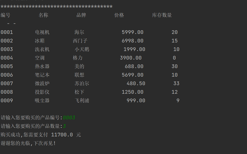 """ 家用电器销售系统 v1.1 """ #欢迎信息 print('欢迎使用家用电器销售系统!') #产品信息列表 print('产品和价格信息如下:') print ( '************************************') print('%-10s'%'编号','%-10s'%'名称','%-10s'%'品牌','%-10s'%'价格','%-10s'%'库存数量') print(' - - ' ) print('%-10s'%'0001','%-10s'%'电视机','%-10s'%'海尔','%10.2f'%5999.00, '%10d ' %20) print('%-10s'%'0002','%-10s'%'冰箱','%-10s'%'西门子','%10.2f'%6998.00, '%10d ' %15) print('%-10s'%'0003','%-10s'%'洗衣机','%-10s'%'小天鹅','%10.2f'%1999.00, '%10d ' %10) print('%-10s'%'0004','%-10s'%'空调','%-10s'%'格力','%10.2f'%3900.00, '%10d ' %0) print('%-10s'%'0005','%-10s'%'热水器','%-10s'%'美的','%10.2f'%688.00, '%10d ' %30) print('%-10s'%'0006','%-10s'%'笔记本','%-10s'%'联想','%10.2f'%5699.00, '%10d ' %10) print('%-10s'%'0007','%-10s'%'微波炉','%-10s'%'苏泊尔','%10.2f'%480.50, '%10d' %33) print('%-10s'%'0008','%-10s'%'投影仪','%-10s'%'松下','%10.2f'%1250.00, '%10d ' %12) print('%-10s'%'0009','%-10s'%'吸尘器','%-10s'%'飞利浦','%10.2f'%999.00,'%10d ' %9) print(' ' ) #商品数据 products=[ ['0001','电视机','海尔',5999.00,20], ['0002','冰箱','西门子',6998.00,15], ['0003','洗衣机','小天鹅',1999.00,10], ['0004','空调','格力',3900.00,0], ['0005','热水器','格力',688.00,30], ['0006','笔记本','联想',5699.00,10], ['0007','微波炉','苏泊尔',480.00,33], ['0008','投影仪','松下',1250.00,12], ['0009','吸尘器','飞利浦',999.00,9], ] #用户输入信息 product_id= input('请输入您要购买的产品编号:') count=int(input('请输入您要购买的产品数量:')) #获取编号对应商品的信息 product_index=len(product_id)-1 product=products[product_index] #计算金额 print('购买成功,您需要支付','{}'.format(product[3]*count),'元') #退出系统 print('谢谢您的光临,下次再见!')