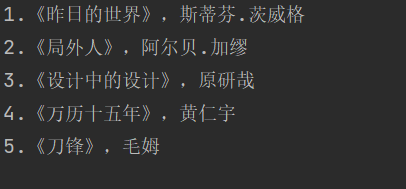 book_infos = [{'书名':'昨日的世界','作者':'斯蒂芬.茨威格'},{'书名':'局外人','作者':'阿尔贝.加缪'},{'书名':'设计中的设计','作者':'原研哉'},{'书名':'万历十五年','作者':'黄仁宇'},{'书名':'刀锋','作者':'毛姆'}]