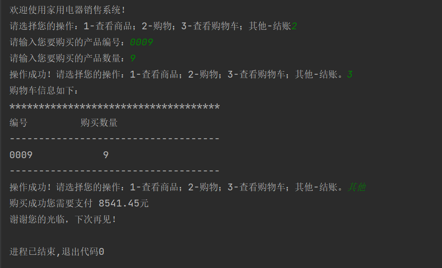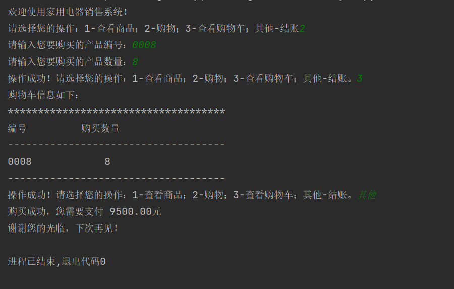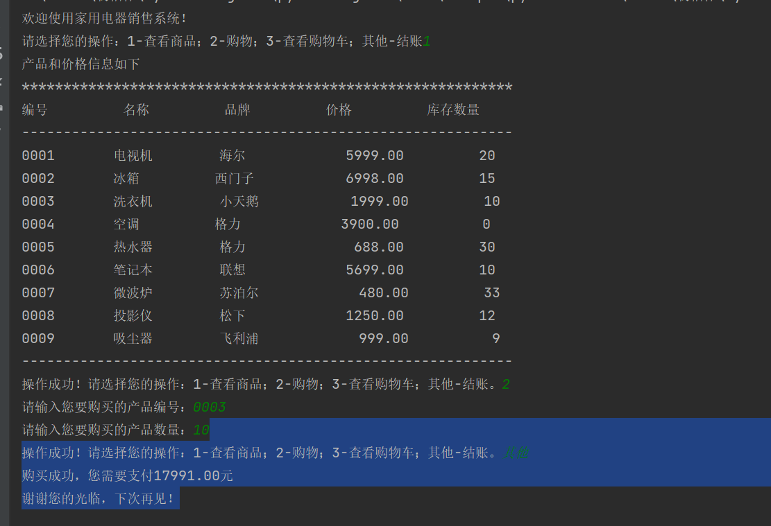 option=input('操作成功!请选择您的操作:1-查看商品;2-购物;3-查看购物车;其他-结账。')