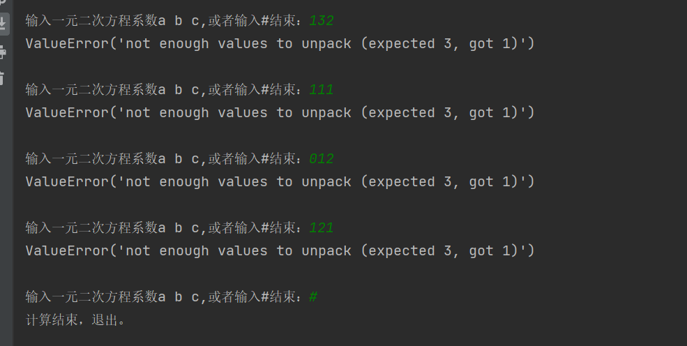 t=input('输入一元二次方程系数a b c,或者输入#结束:')