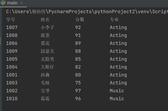 print('{:<8}\t{:<8}\t{:<8}\t{}'.format(item['学号'], item['姓名'], str(item['分数']), major))