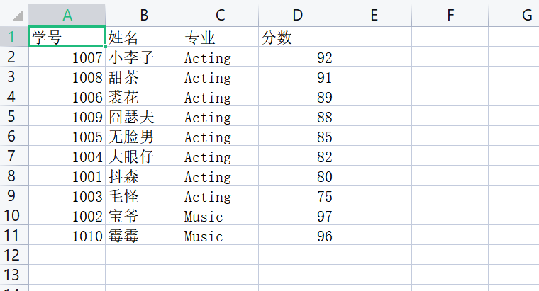 datas[major].append({'学号': student_id, '姓名': name, '分数': score})