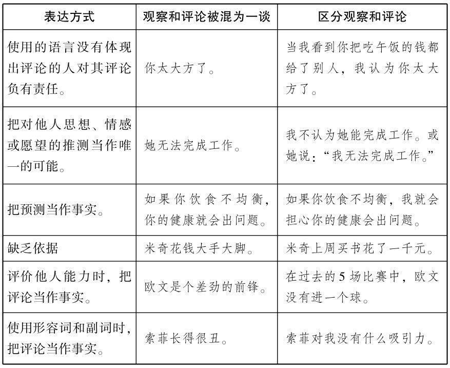 - 对他人的评价实际上反应了我们的需求和价值,我们不应该把价值判断与道德判断混为一谈,我们应该学会爱的语言直接说出自己的价值观而不是去指责他人(道德判断)。