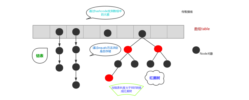 而JDK1.8中,哈希表存储采用数组+链表+红黑树实现,当链表长度超过阈值(8)时,将链表转换为红黑树,这样大大减少了查找时间。