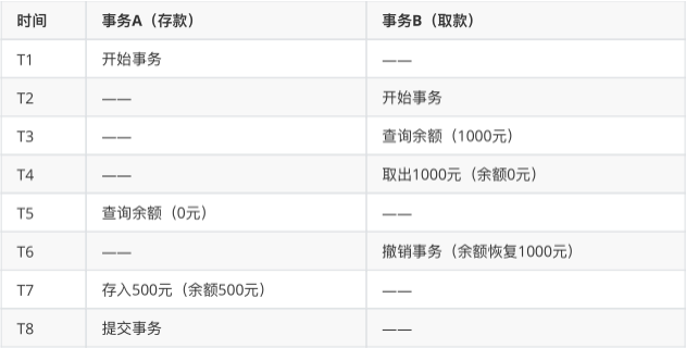 A提交之后查询到的余额应该为500元才对,然而为1500。请看T5时间点,事务A此时查询的余额为0,这个数据就是脏数据,他是事务B造成的, 很明显是事务没有进行隔离造成的。