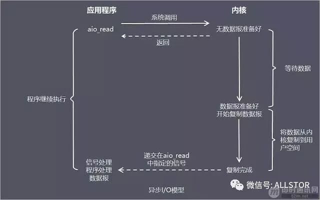 这种模型与信号驱动模型的主要区别在于:信号驱动 I/O 是由内核通知应用程序何时启动一个 I/O 操作,而异步 I/O 模型是由内核通知应用程序 I/O 操作何时完成。