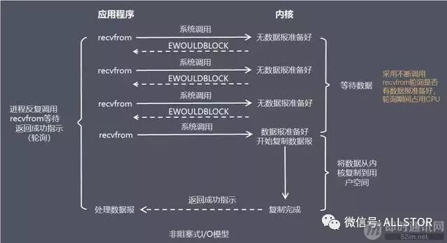 而是返回一个错误,应用程序基于 I/O 操作函数将不断的轮询数据是否已经准备好,如果没有准备好,继续轮询,直到数据准备好为止。