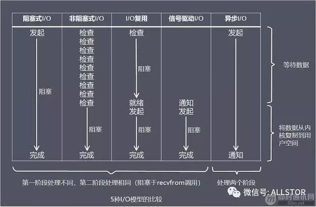 实际应用程序在系统调用完成上面的 2 步操作时,调用方式的阻塞、非阻塞,操作系统在处理应用程序请求时,处理方式的同步、异步处理的不同,可以分为 5 种 I/O 模型(参考“UNIX网络编程卷1”)。