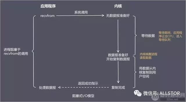 在阻塞式 I/O 模型中,应用程序在从调用 recvfrom 开始到它返回有数据报准备好这段时间是阻塞的,recvfrom 返回成功后,应用进程开始处理数据报。