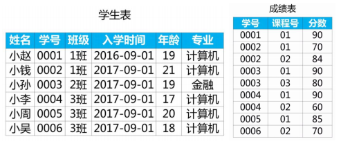 “成绩” 表记录了学生选修的课程,以及对应课程的成绩。这两个表通过 “学号” 进行关联。现在要查找出所有学生的学号,姓名,课程和成绩。