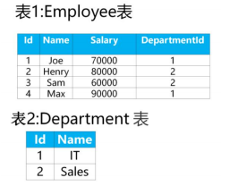 有两个表,Employee 表用于记录员工的薪水和在哪个部门,包括员工的 Id、员工的姓名(Name)、薪水(Salary) 和 员工所在部门 Id(Department Id)。