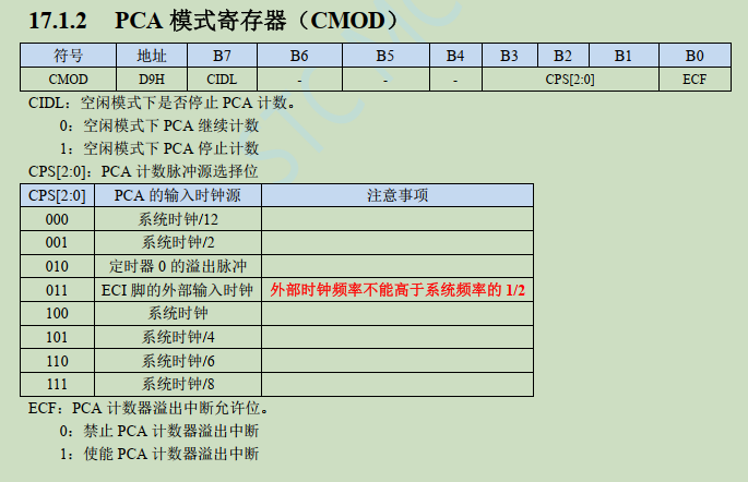 3、配置PCA模式寄存器,选择时钟源