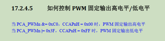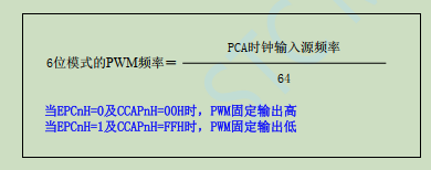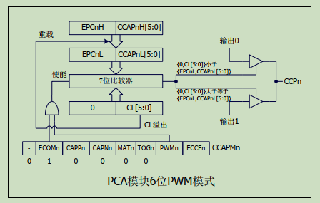 计数值CL[5:0]与CCAPnL[5:0]比较,小于输出低电平,大于等于输出高电平,CL值溢出后,重载值从CCAPnH载入CCAPnL,所以修改占空比修改CCAPnH值,6位PWM周期0x40