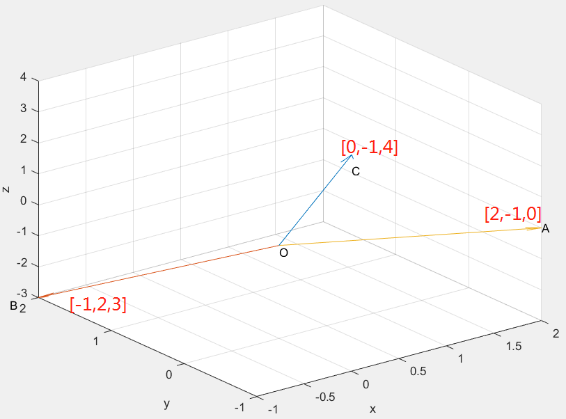 clear;clc;close all; O=[0,0,0]; A=[2,-1,0]; B=[-1,2,-3]; C=[0, -1,4]; %A=[4,5,6]; %B=[-10,6,7]; %C=[-1 ,8,0]; scale=1; %quiver3(A(1),A(2),A(3),B(1)-A(1),B(2)-A(2),B(3)-A(3),scale);%表示以A为起点,由A指向B text(A(1),A(2),A(3),'A');%在A点附件标注字母A %axis([-10 4 5 8 0 7]);xlabel('x');ylabel('y');zlabel('z');%规范x,y,z坐标轴刻度范围,及在各自坐标轴上标注字母x,y,z axis([-1 2 -1 2 -3 4]);xlabel('x');ylabel('y');zlabel('z');%规范x(-10,4),y(5,8),z(0,7)坐标轴刻度范围,及在各自坐标轴上标注字母x,y,z grid on;%绘网格 hold on; %quiver3(B(1),B(2),B(3),C(1)-B(1),C(2)-B(2),C(3)-B(3),scale); text(B(1)-0.3,B(2),B(3),'B'); hold on; %quiver3(A(1),A(2),A(3),C(1)-A(1),C(2)-A(2),C(3)-A(3),scale); text(C(1),C(2),C(3)-0.5,'C'); hold on; text(O(1),O(2),O(3)-0.2,'O'); quiver3(O(1),O(2),O(3),C(1)-O(1),C(2)-O(2),C(3)-O(3),scale); quiver3(O(1),O(2),O(3),B(1)-O(1),B(2)-O(2),B(3)-O(3),scale); quiver3(O(1),O(2),O(3),A(1)-O(1),A(2)-O(2),A(3)-O(3),scale);