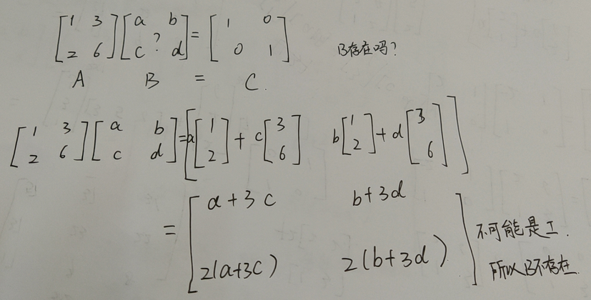可逆矩阵就是一个矩阵经过一系列初等(行)变换后,可以变成单位阵的矩阵。但是这个矩阵在第二步的初等行变换的时候怎么也变不成单位阵,所以它不可逆。就是B矩阵无论什么样对C矩阵的行进行的线性组合都不会变成C矩阵的第一行[1 0].