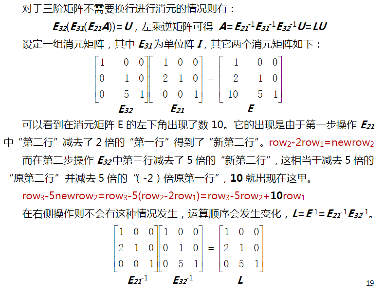 E32(E31(E21A))=U,左乘逆矩阵可得 A=E21-1E31-1E32-1U=LU