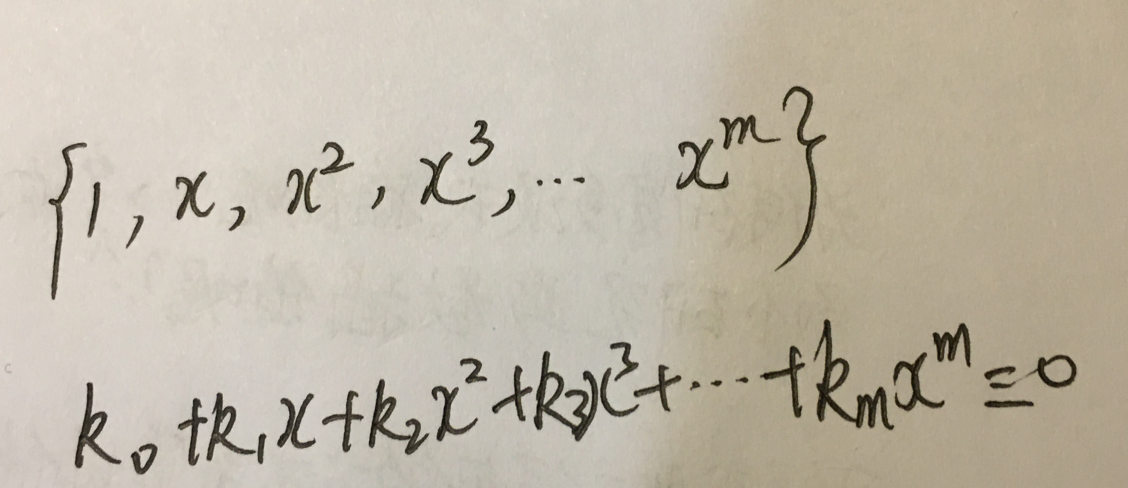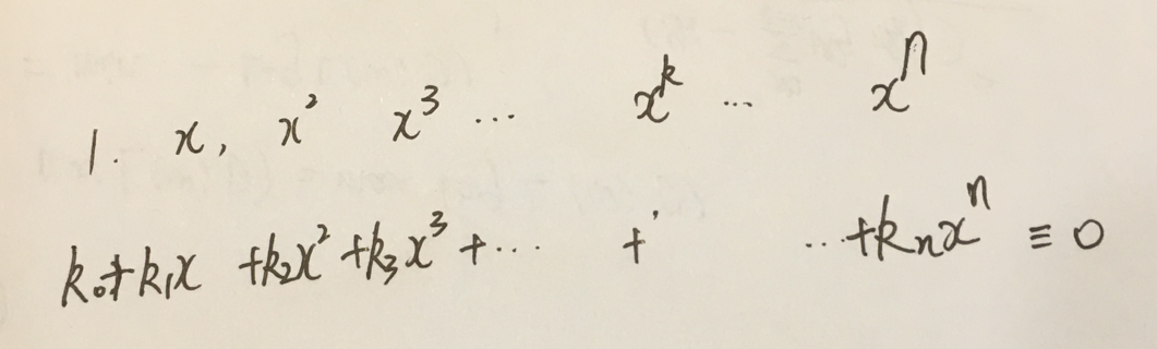 也就是说是否存在一组系数k可以使得上式恒等于0呢?答案肯定是不存在的因为次多项式有n个根不是无穷多个根是有限个根,什么样子的多项式有无穷多个根呢?只有0才有无穷多个根,所以不可能存在一组系数k使得上是恒等于0。所以是线性无关的,这样看来,拉格朗日插值的时候,那组基函数就是线性无关的。牛顿插值的那组基函数也是线性无关的,所以才能表示出任意的插值函数。