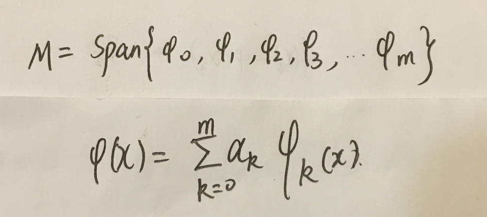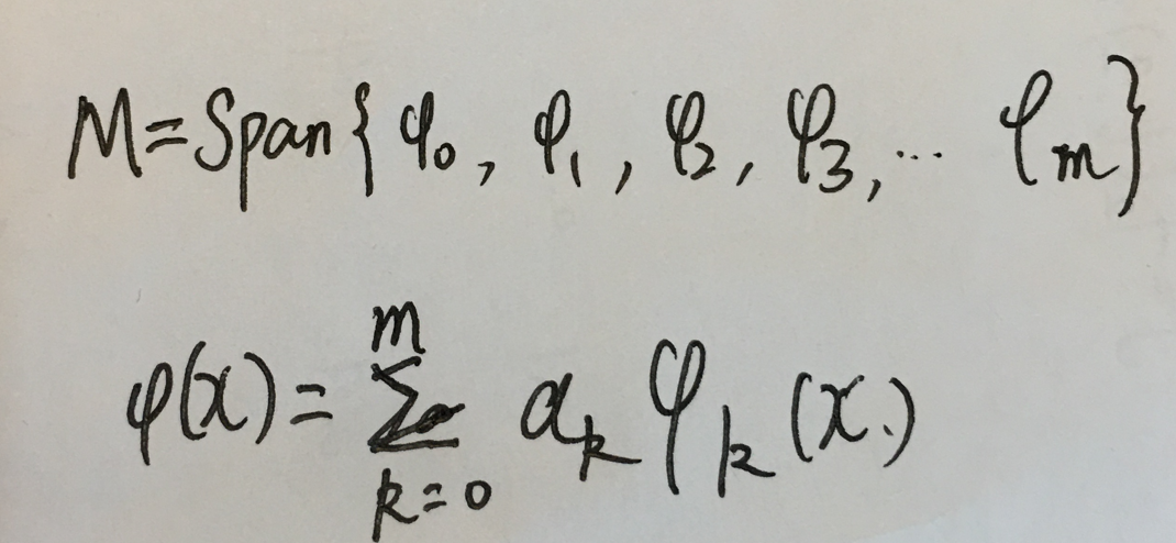 2.最佳一致逼近,最佳平方逼近,最佳一次逼近,里面的拟合函数φ(x)都是在某个(由一组线性无关的基底函数)组成的函数空间上的。