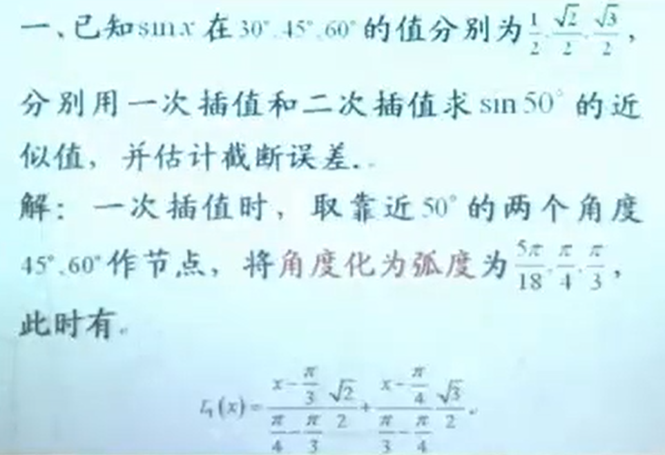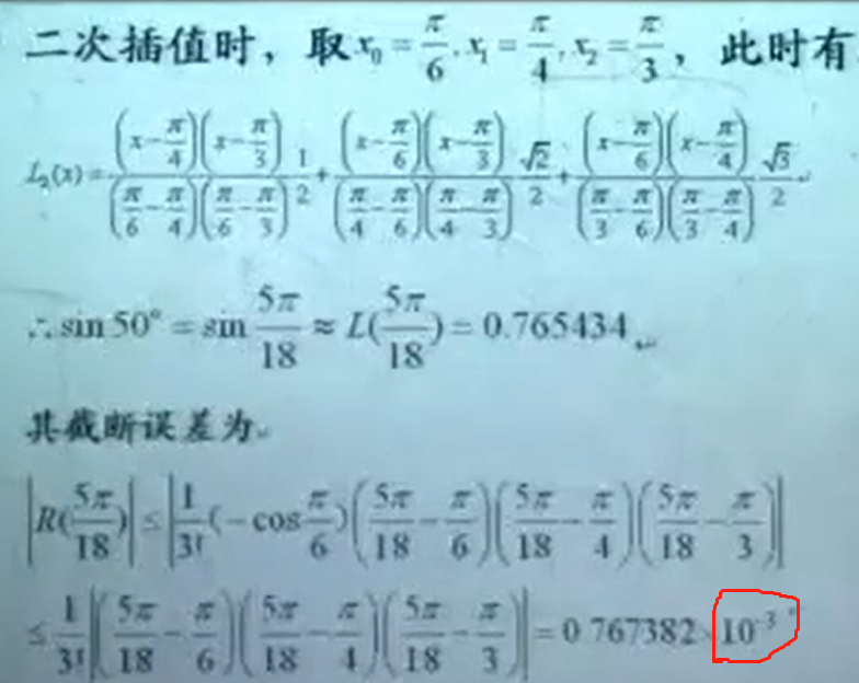 2.在计算阶段误差的时候,ε是位于第一个插值点和最后一个插值点的值。在一次插值的时候,ε的范围是Π/4到Π/3之间的。