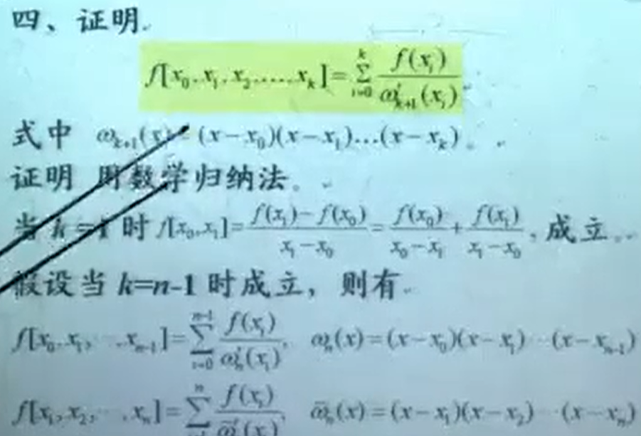 5.在证明的过程中,假定有k=n时等式成立,解释:对于等式而言,假定对于n+1个点的n阶差商成立,再证明对于n+2个点的n+1阶差商成立就行了。