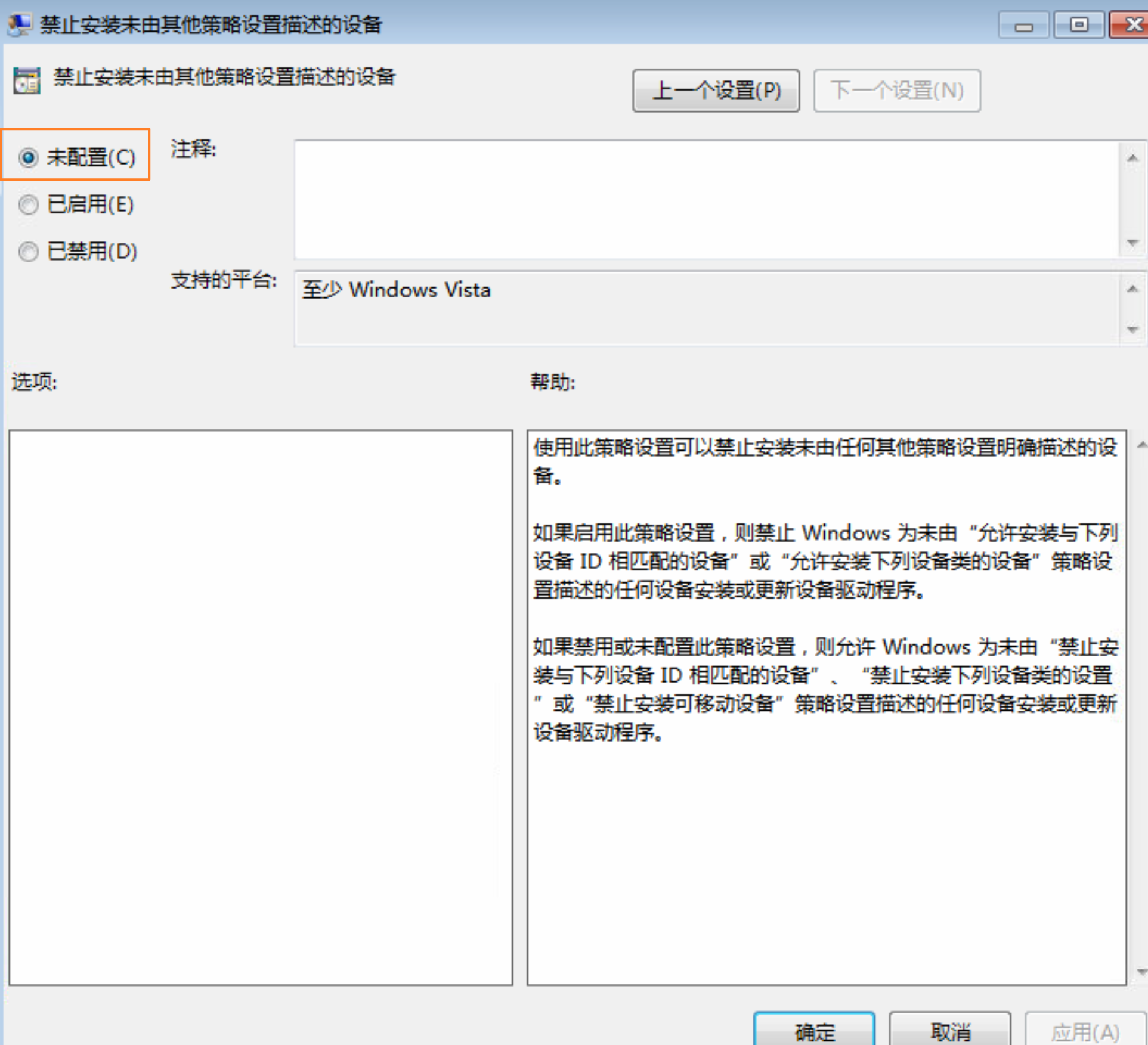 9、我们点击应用-确定以后,在本地组策略编辑器中,禁止安装未由其他策略设置描述的设备选项为“未配置”,退出本地组策略编辑器。