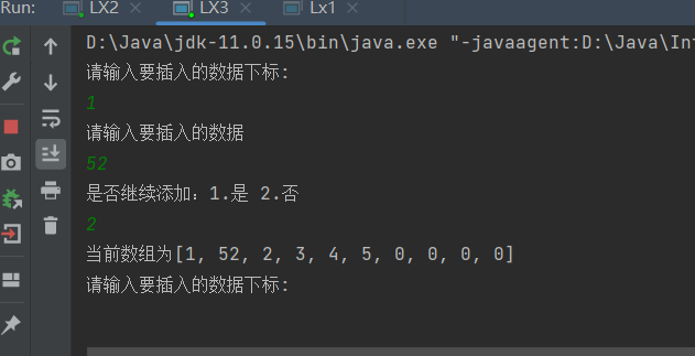 while (true){ Scanner sc = new Scanner(System.in); int [] arr = new int[]{1,2,3,4,5}; System.out.println("请输入要插入的数据下标:"); int index = sc.nextInt(); System.out.println("请输入要插入的数据"); int num = sc.nextInt(); int [] newArr = new int[arr.length*2]; for (int i = 0; i < arr.length; i++) { newArr[i]=arr[i]; } arr=newArr; int temp = arr[index]; arr[index]=num; for (int i = 1; i < arr.length-index; i++) { arr[arr.length-i]=arr[arr.length-i-1]; } arr[index+1]=temp; // System.out.println("数组为"); // System.out.println(Arrays.toString(arr)); System.out.println("是否继续添加:1.是 2.否"); String flag = sc.next(); switch (flag){ case "1": continue; case "2": System.out.println("当前数组为"+ Arrays.toString(arr)); break;} }