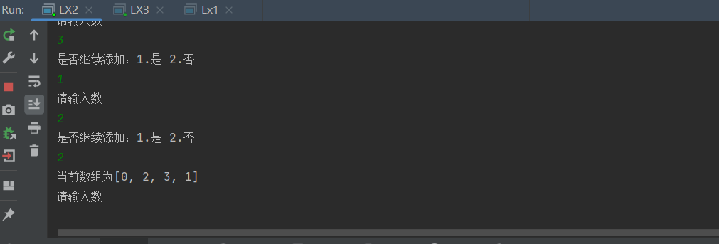 int[]arr = new int[2]; int i=0; while (true){ System.out.println("请输入数"); Scanner sc = new Scanner(System.in); int num = sc.nextInt(); arr[arr.length-1-i]=num; i++; if(i>= arr.length){ int [] newArr=new int[arr.length*2]; for (int j = 0; j < arr.length; j++) { newArr[newArr.length-1-j]=arr[arr.length-1-j]; // newArr[newArr.length-2-j]=num; } arr=newArr; } System.out.println("是否继续添加:1.是 2.否"); String flag = sc.next(); switch (flag){ case "1": continue; case "2": System.out.println("当前数组为"+ Arrays.toString(arr)); break; // System.exit(-1); 强行退出 // 不写标签,跳switch } }