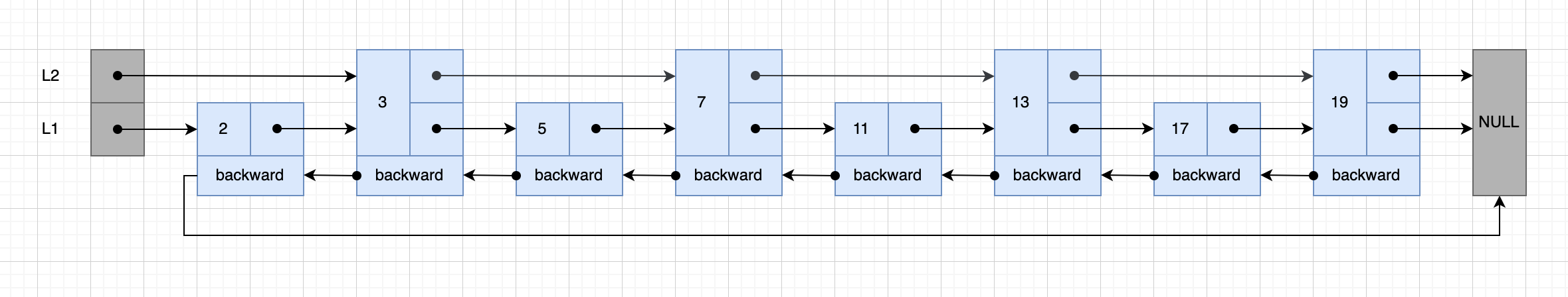 之前我们是从第一层开始的,但这次我们从第二层,也就是 L2节点开始,通过next指针跳过了 元素2 直接指向 元素3,再指向 元素7,一直到比 元素18 大的 元素19,然后通过backward指针找到前一个 元素17,元素18 又大于它,所以我们最终把元素添加到这里,通过5个指针(简略为数红箭头个数)寻址到最后结果。