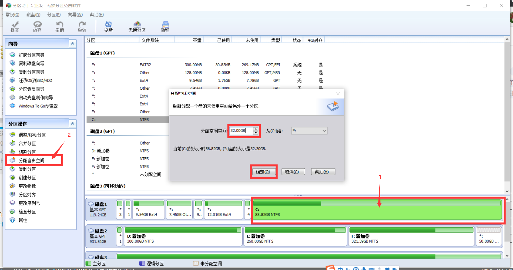 现在分区吧! 打开“分区助手5.5”,选择C盘【注意:启动盘必须是C盘】,再点击“合并分区”,“分配空闲空间”,设置想要分配的空间,点击确定,再点击提交,然后点击执行。如果有提示重启,那就重启,前提是先保存自己的零时文件。