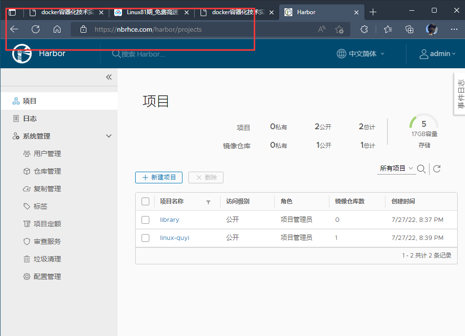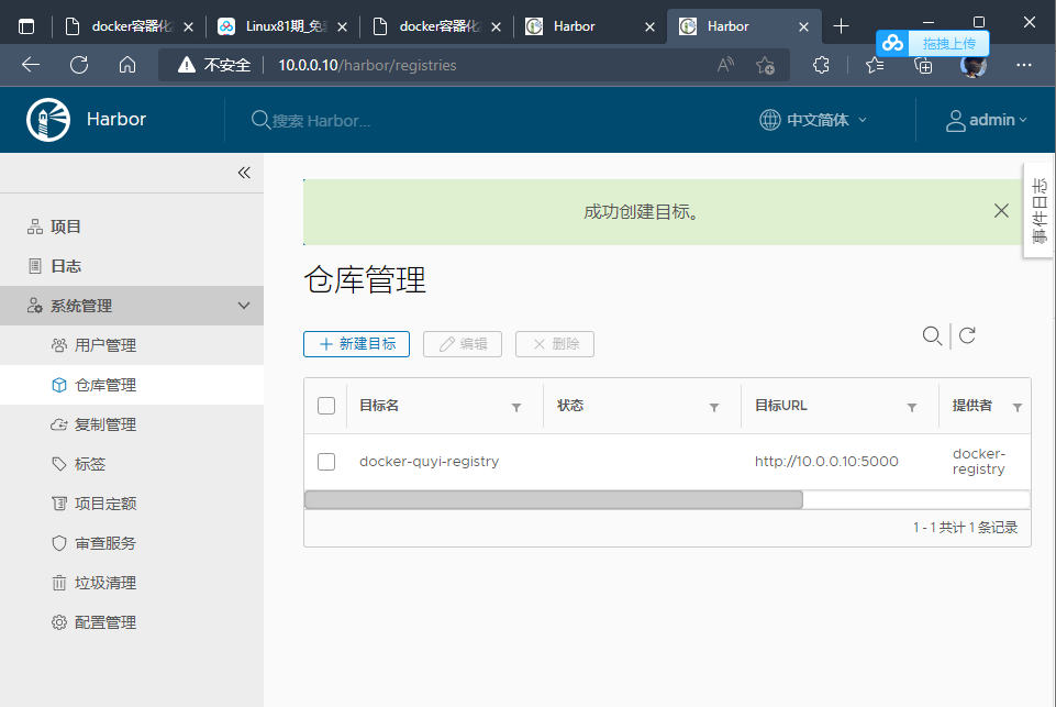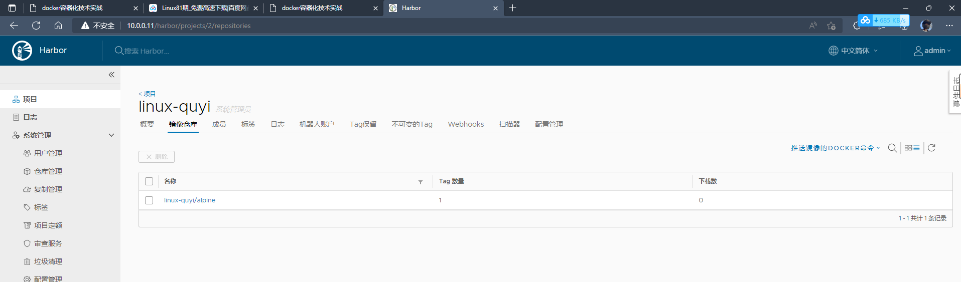 [root@harbor01 ~]# docker push 10.0.0.129/linux-quyi/alpine:latest