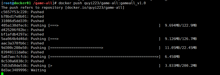 [root@docker01 /game-all]# docker push quyi223/game-all:gameall_v1.0