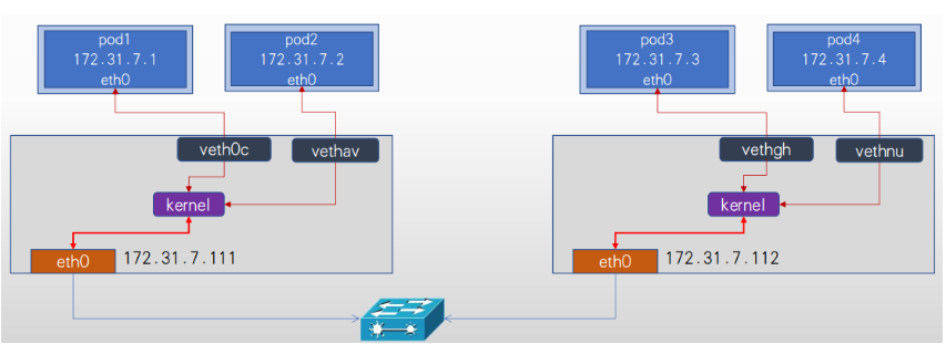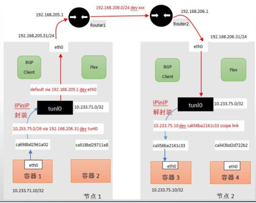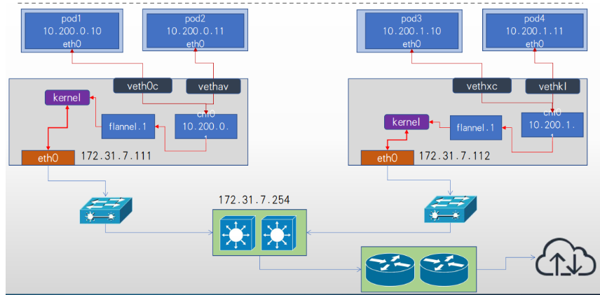 - 将pod地址信息封装在宿主机地址信息以内,实现跨主机且可跨node子网的通信报文