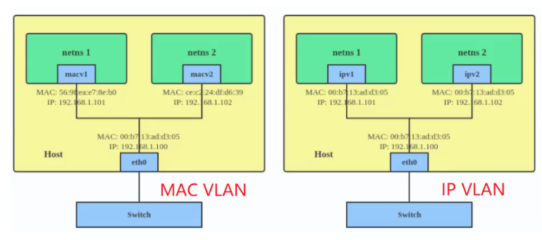 - IP VLAN类似于MAC VLAN,它同样创建新的虚拟网络接口并为每个接口分配唯一的IP地址,不同之处在于,每个虚拟接口将共享使用物理接口的MAC地址