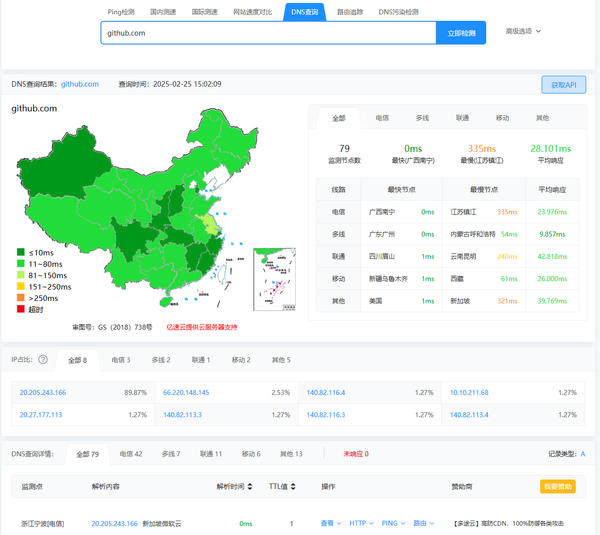 打开网站Dns检测|Dns查询 - 站长工具, 查询github.com的DNS,然后在hosts添加对应的map