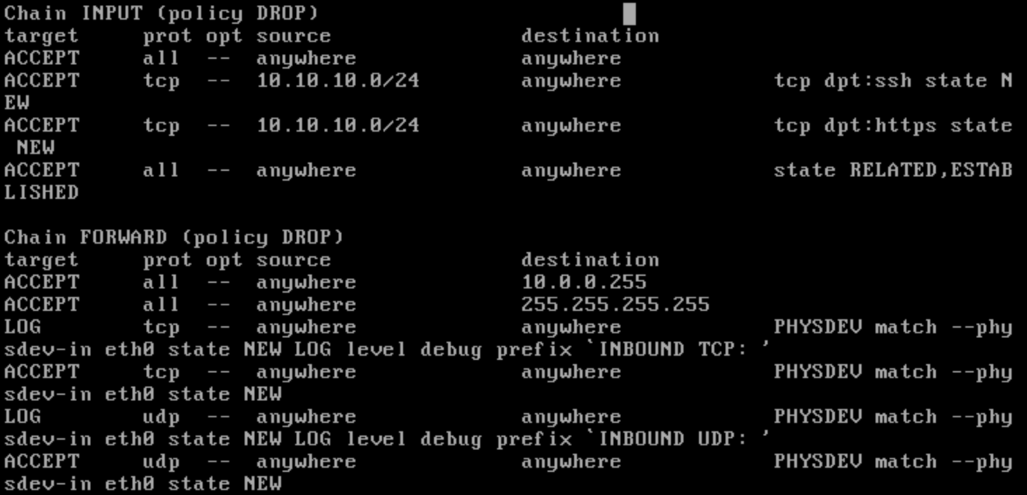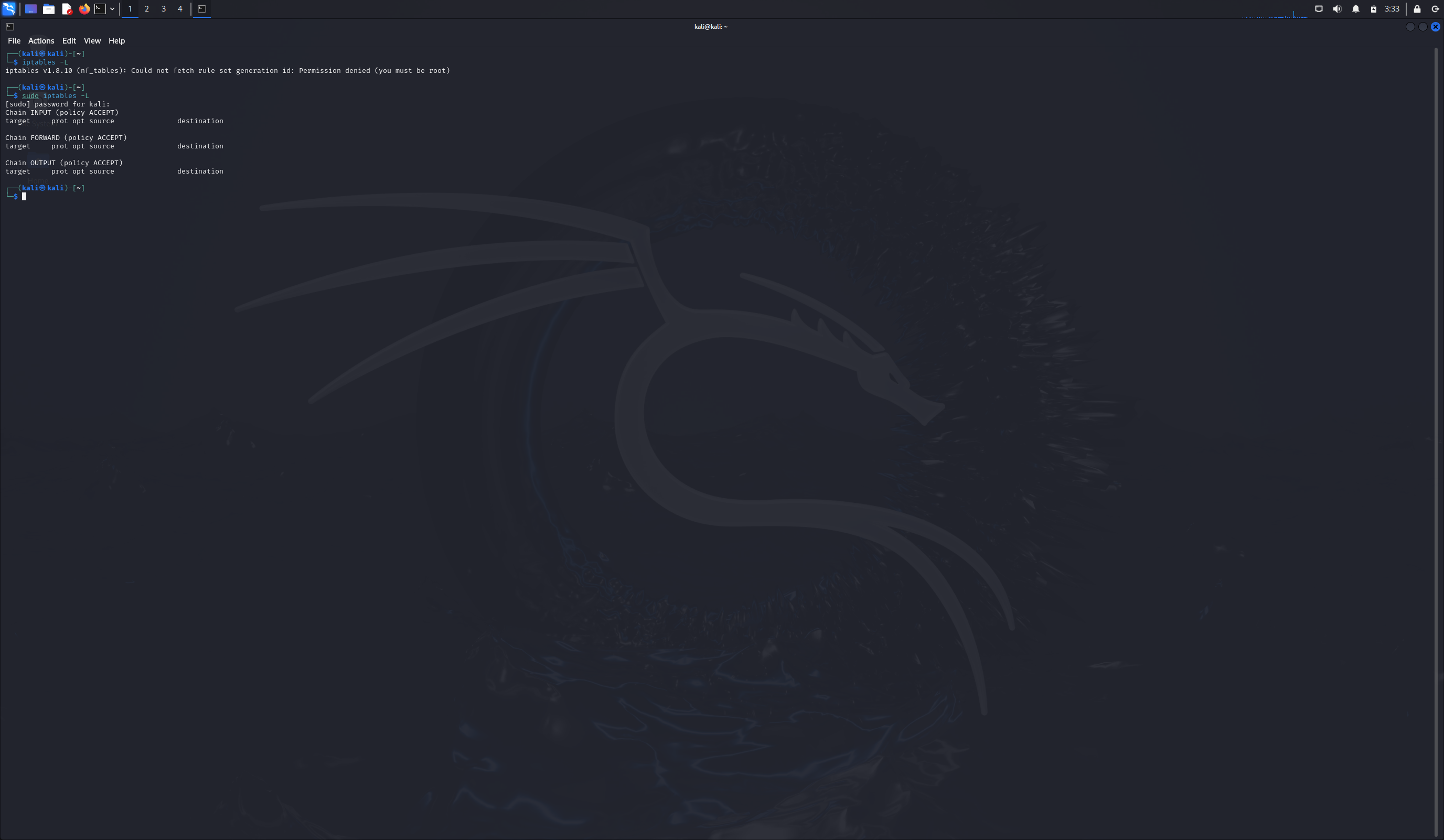 首先打开kali虚拟机,输入 sudo iptables -L查看规则,可以看到当前没有任何规则