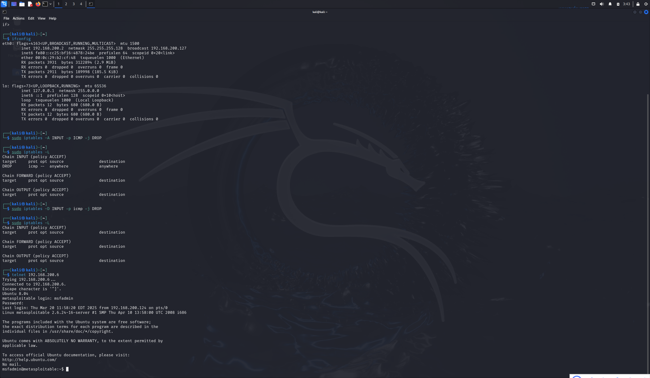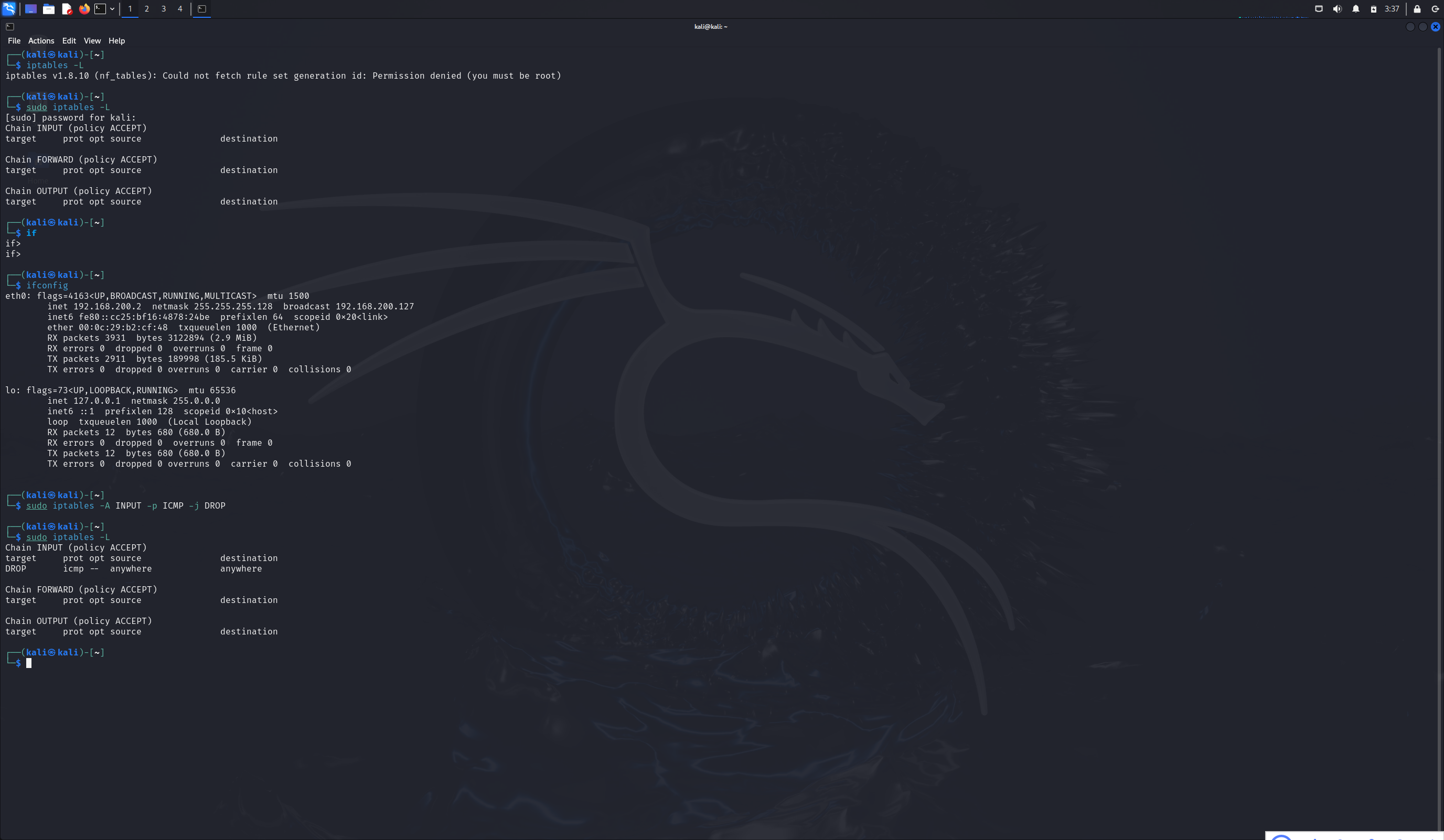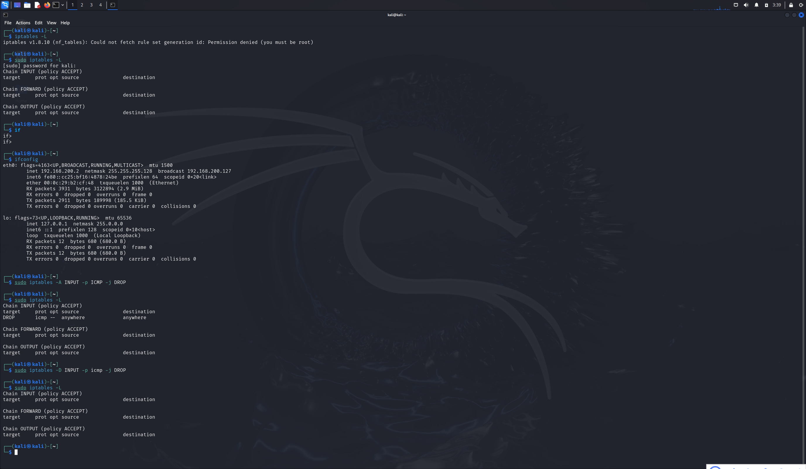 在kali机上输入sudo iptables -A INPUT -p ICMP -j DROP配置防火墙,把ICMP包过滤掉,再使用iptables -L查看规则