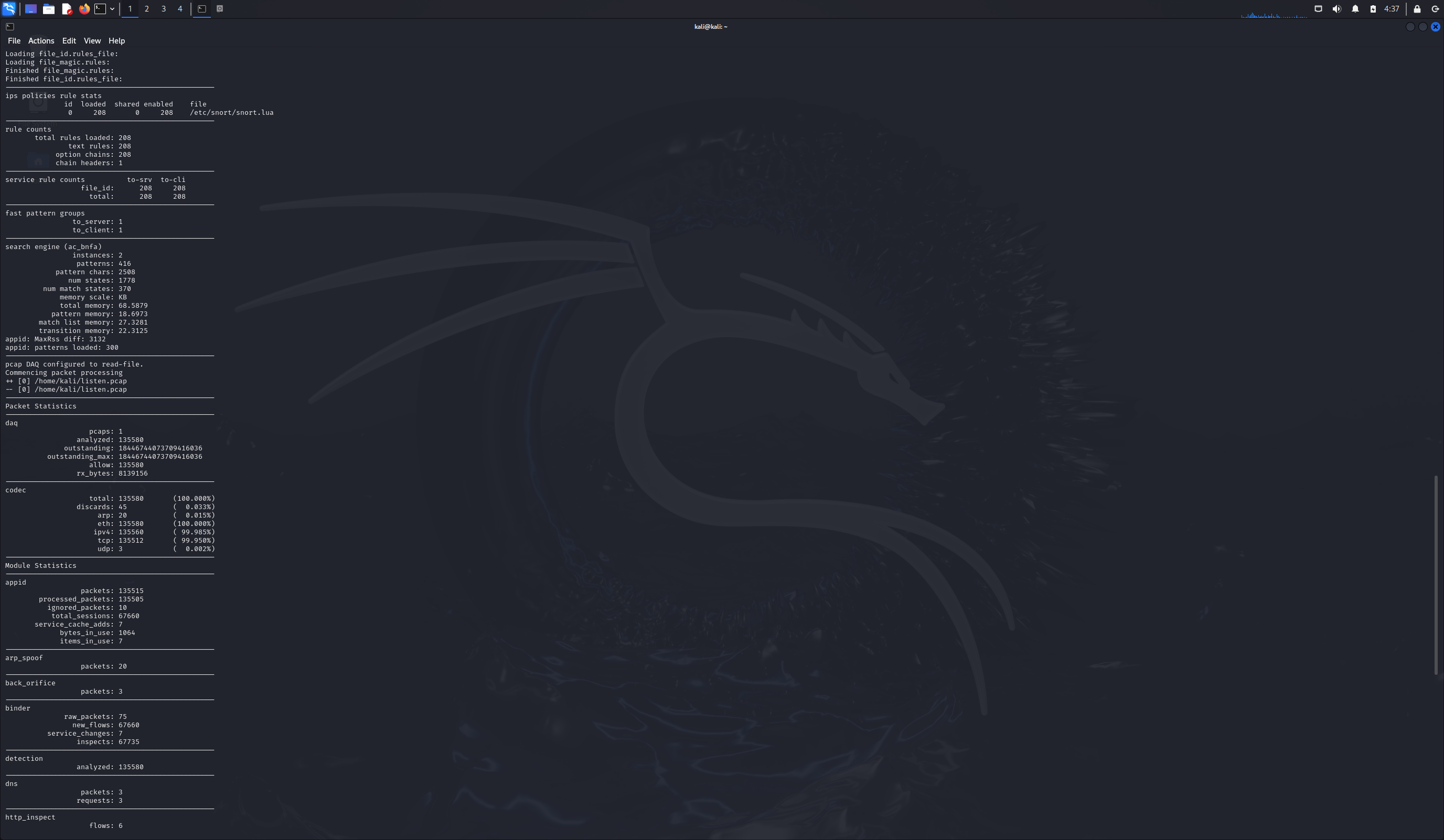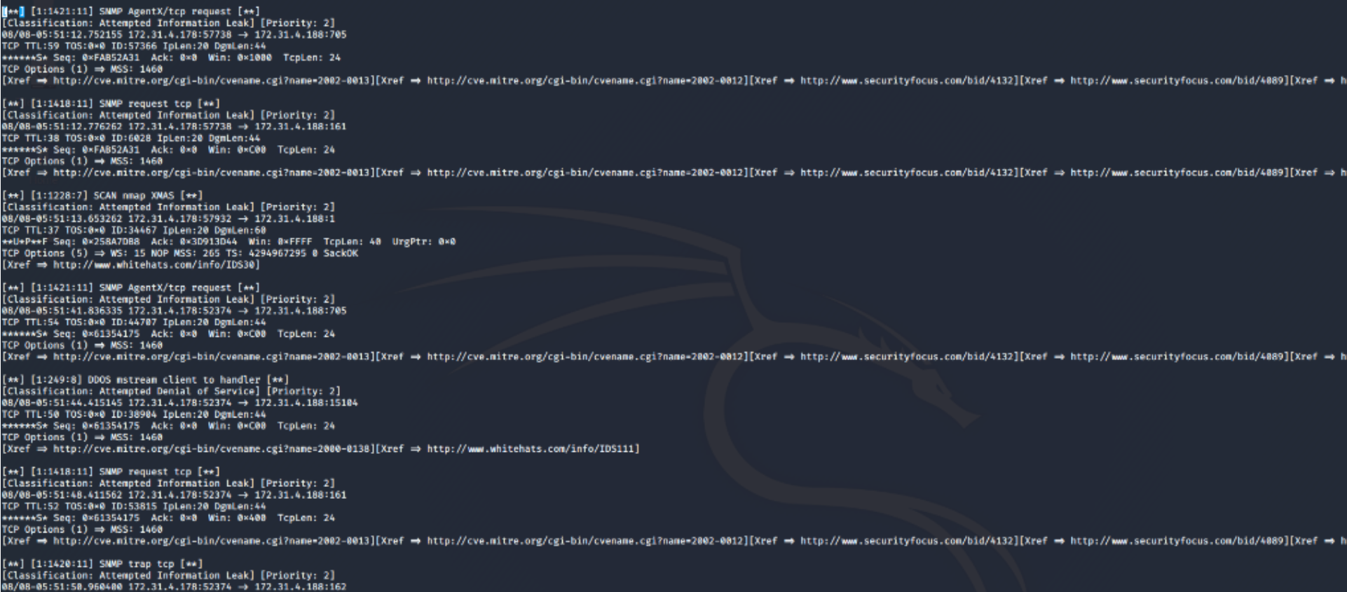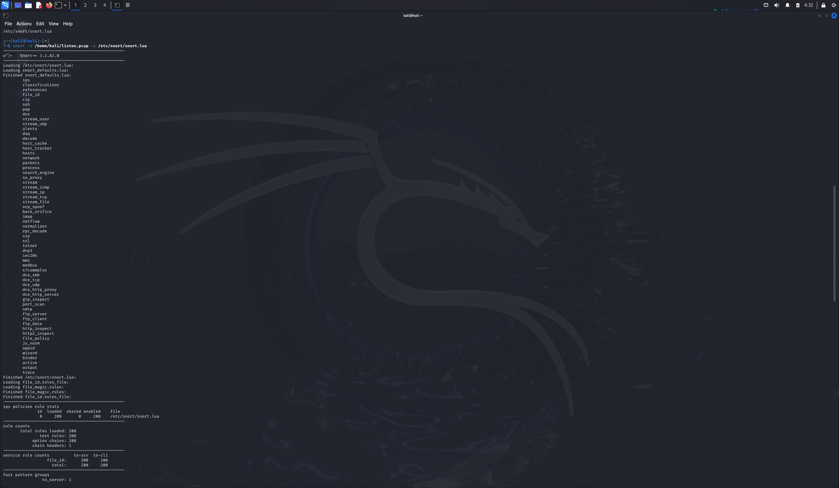 使用Snort对给定pcap文件进行入侵检测,并对检测出的攻击进行说明。打开kali,运行sudo snort -r /home/kali/listen.pcap -c /etc/snort/snort.lua