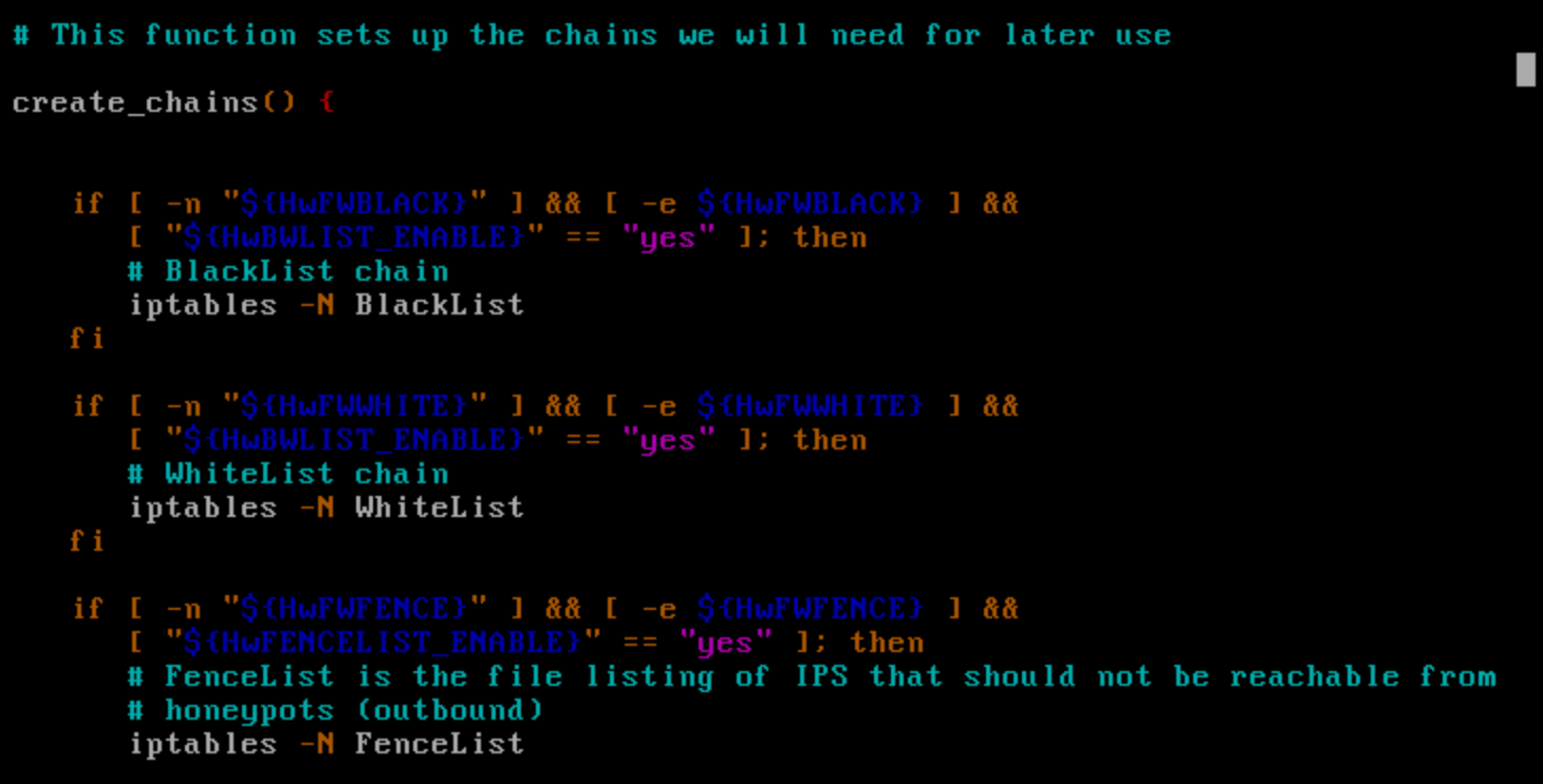 打开蜜网网关虚拟机,使用命令vim /etc/init.d/rc.firewall,可以看到黑名单、白名单和防护名单三个链