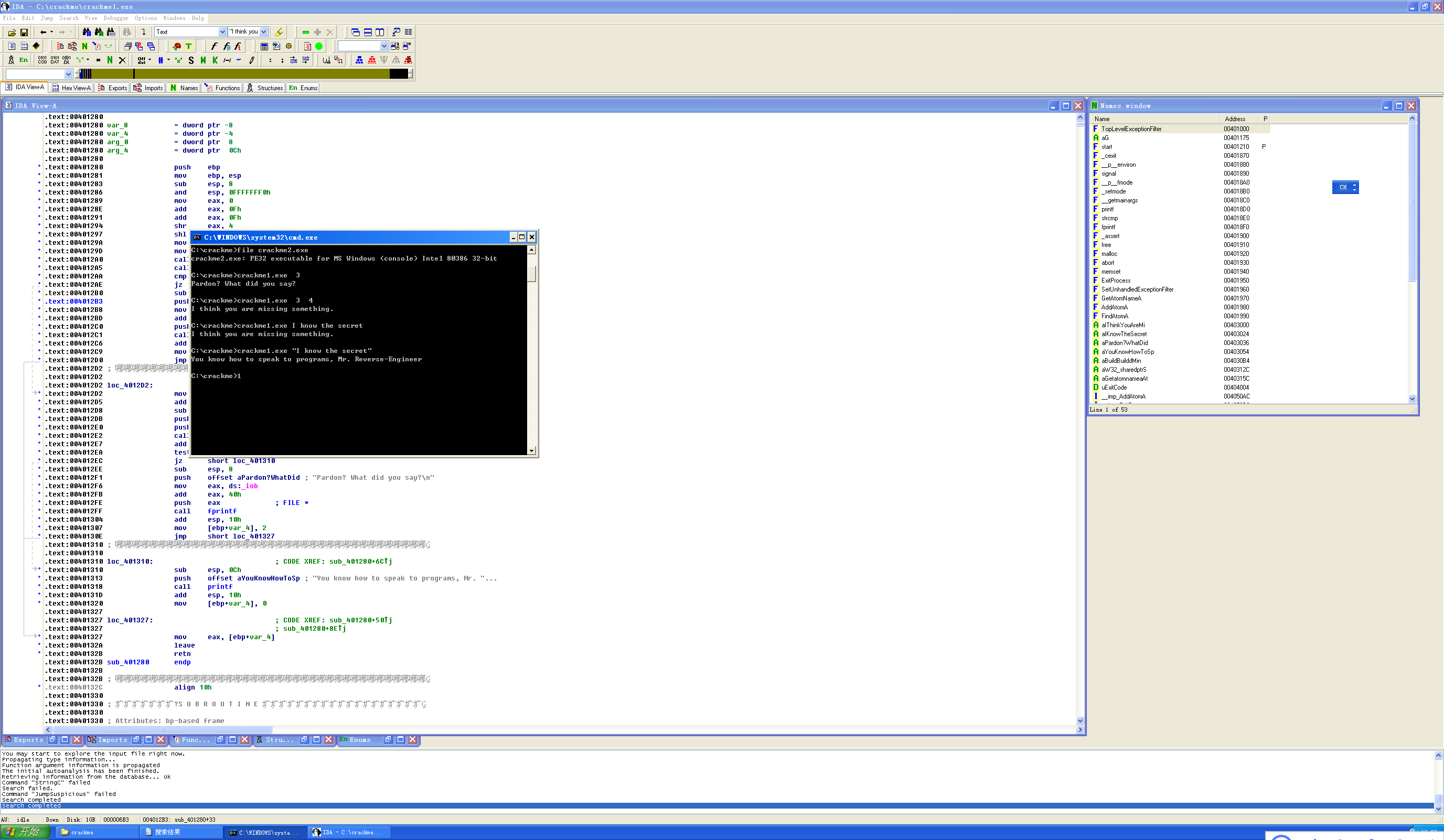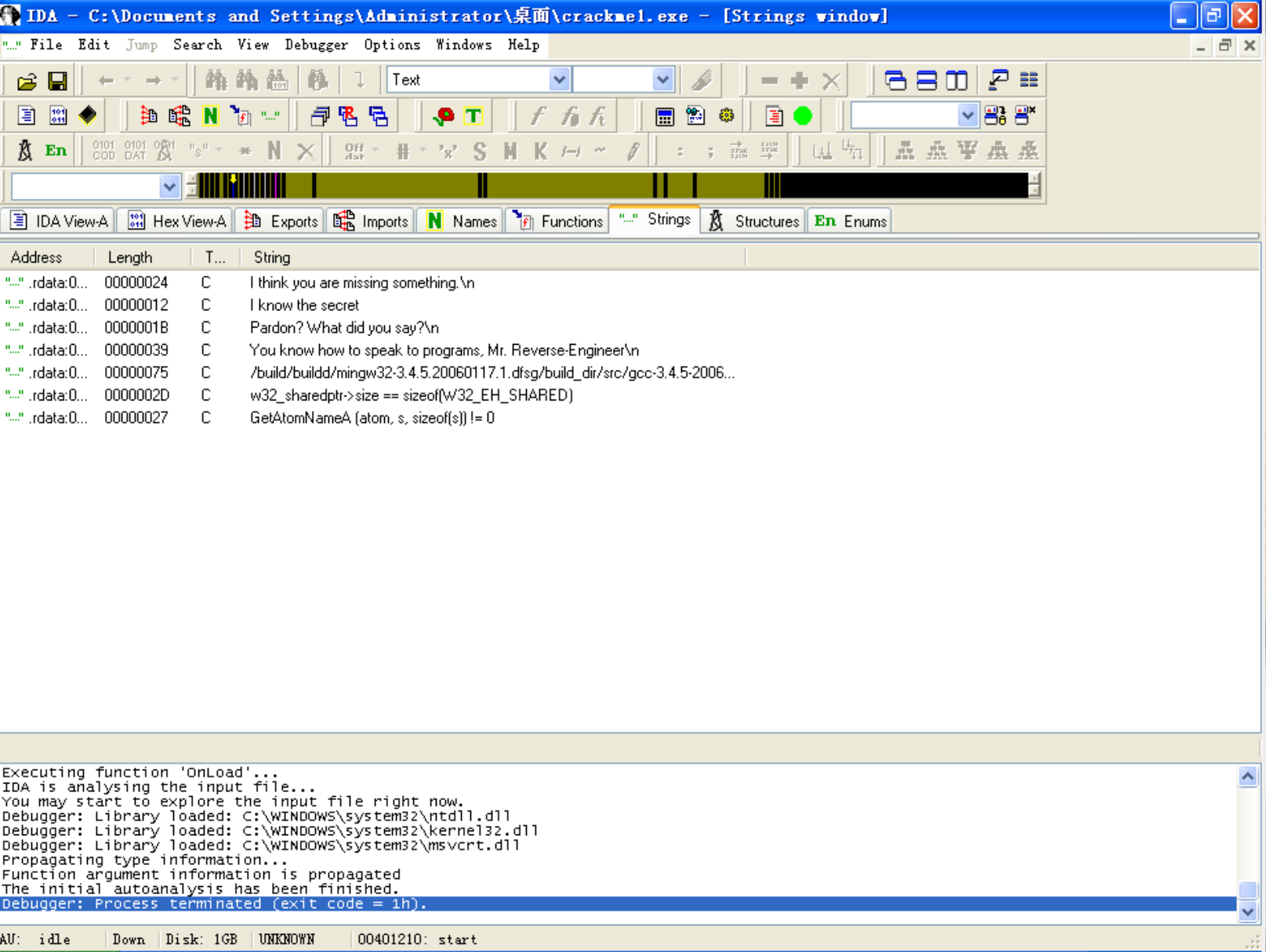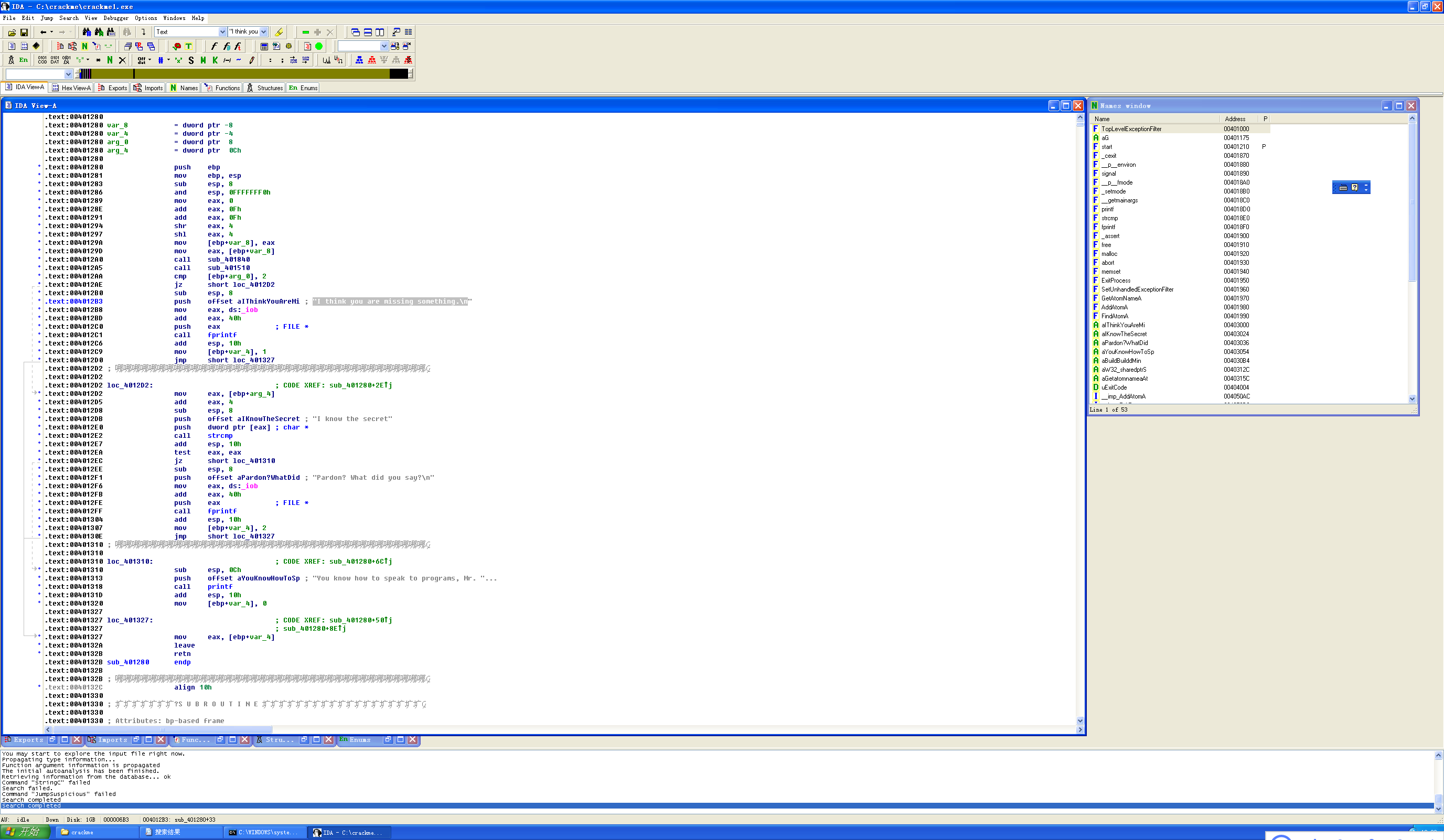 接下来利用IDA Pro打开这个程序分析,打开我们打开通过Strings窗口可以查看该程序中出现的字符串。通过Strings窗口可以查看到该程序中出现的明文字符串,可以看到前面的两种输出信息,“I think you are missing something.” “Pardon? What did you say?”,还发现了“I know the secret”和“You know how to speak to programs, Mr. Reverse-Engineer”这两个字符串。由此我们可以猜测,前者就是我们需要的口令,后者就是输入口令正确时程序的输出信息。