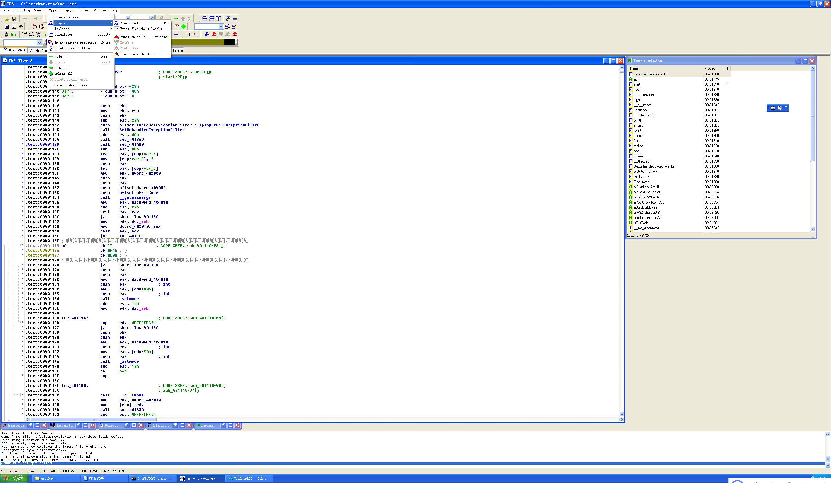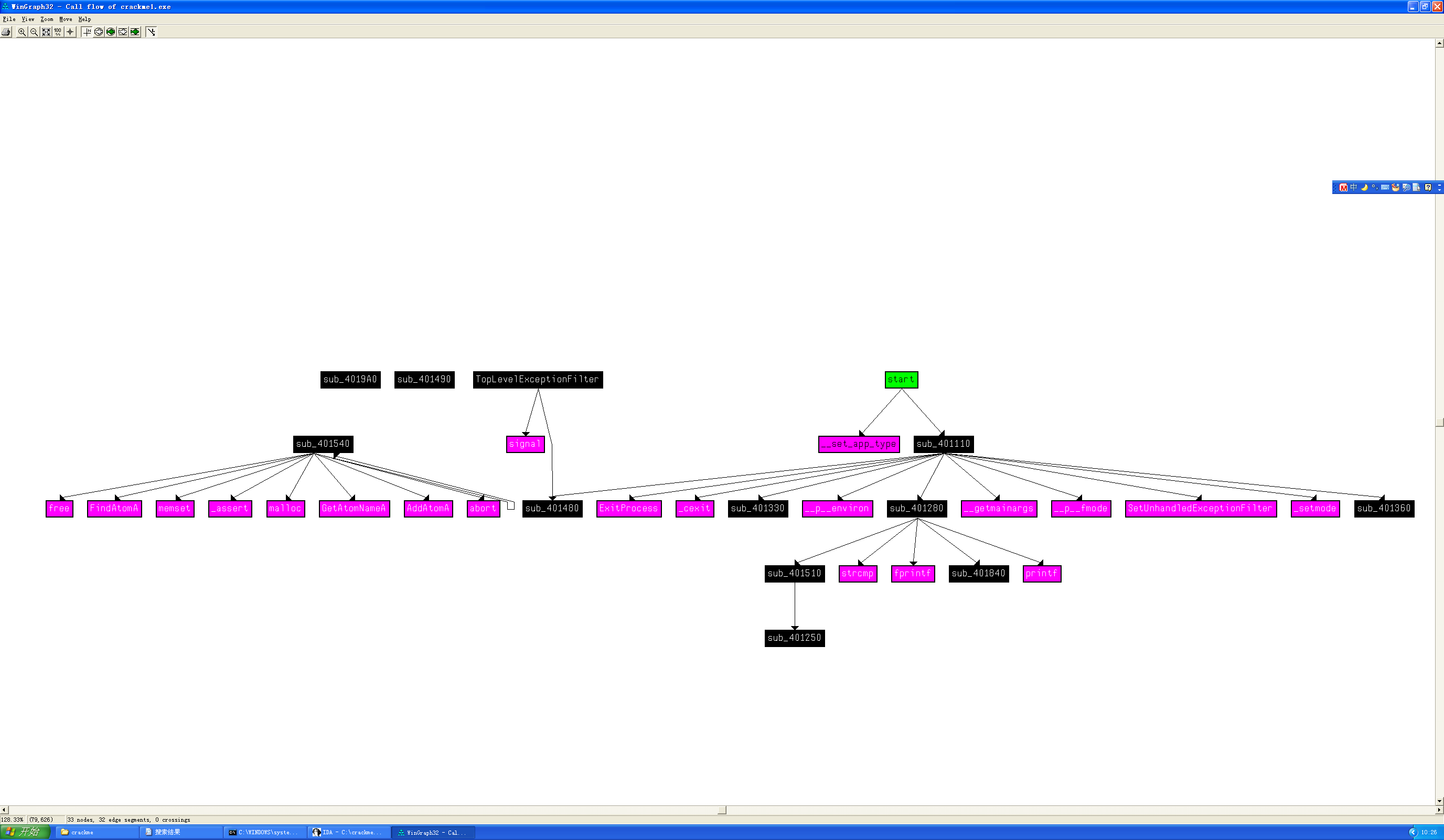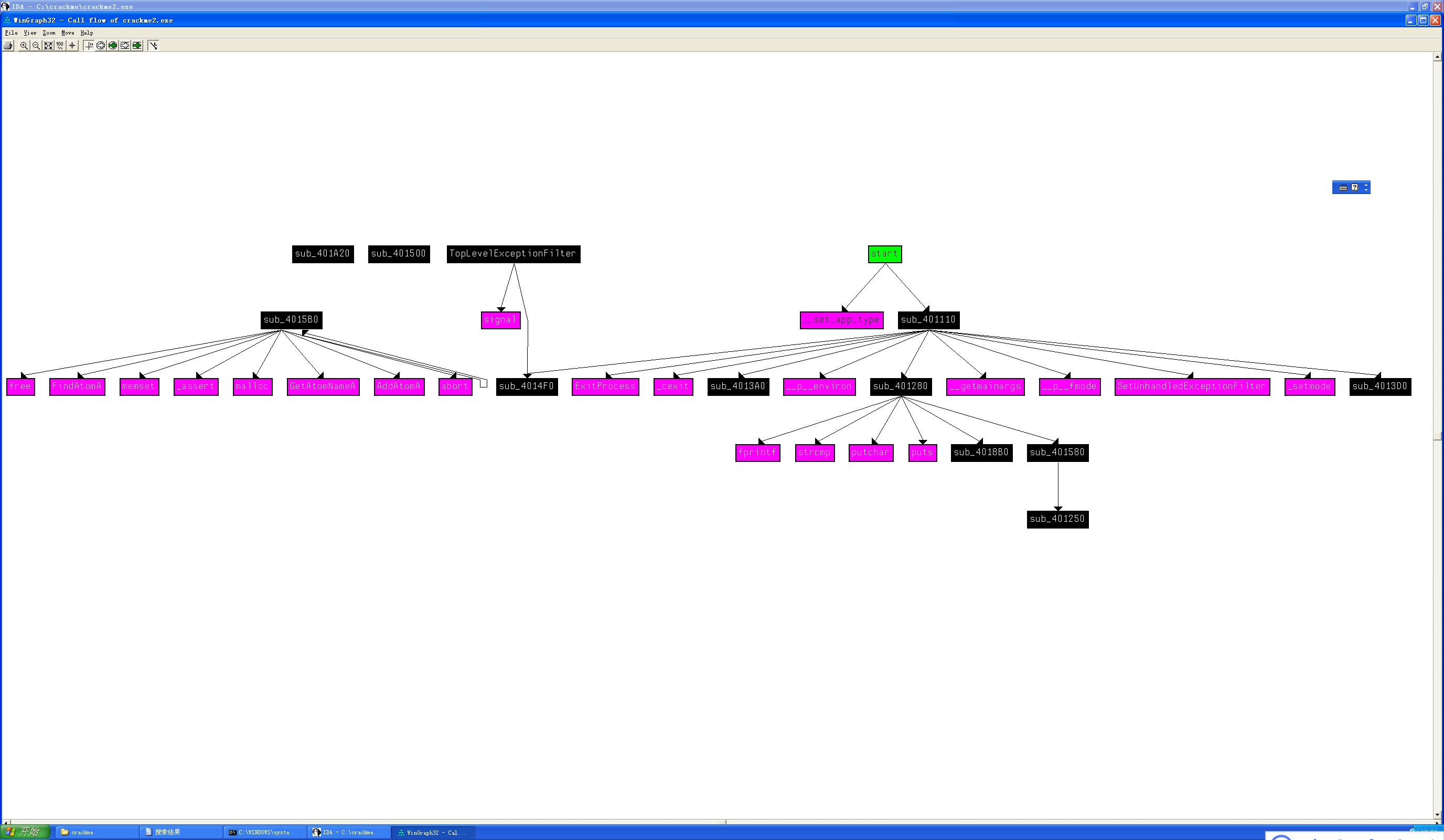 程序crackme2.exe的分析过程与之类似,先打开Function call(函数调用图),发现关键的部分在sub_401280这里。