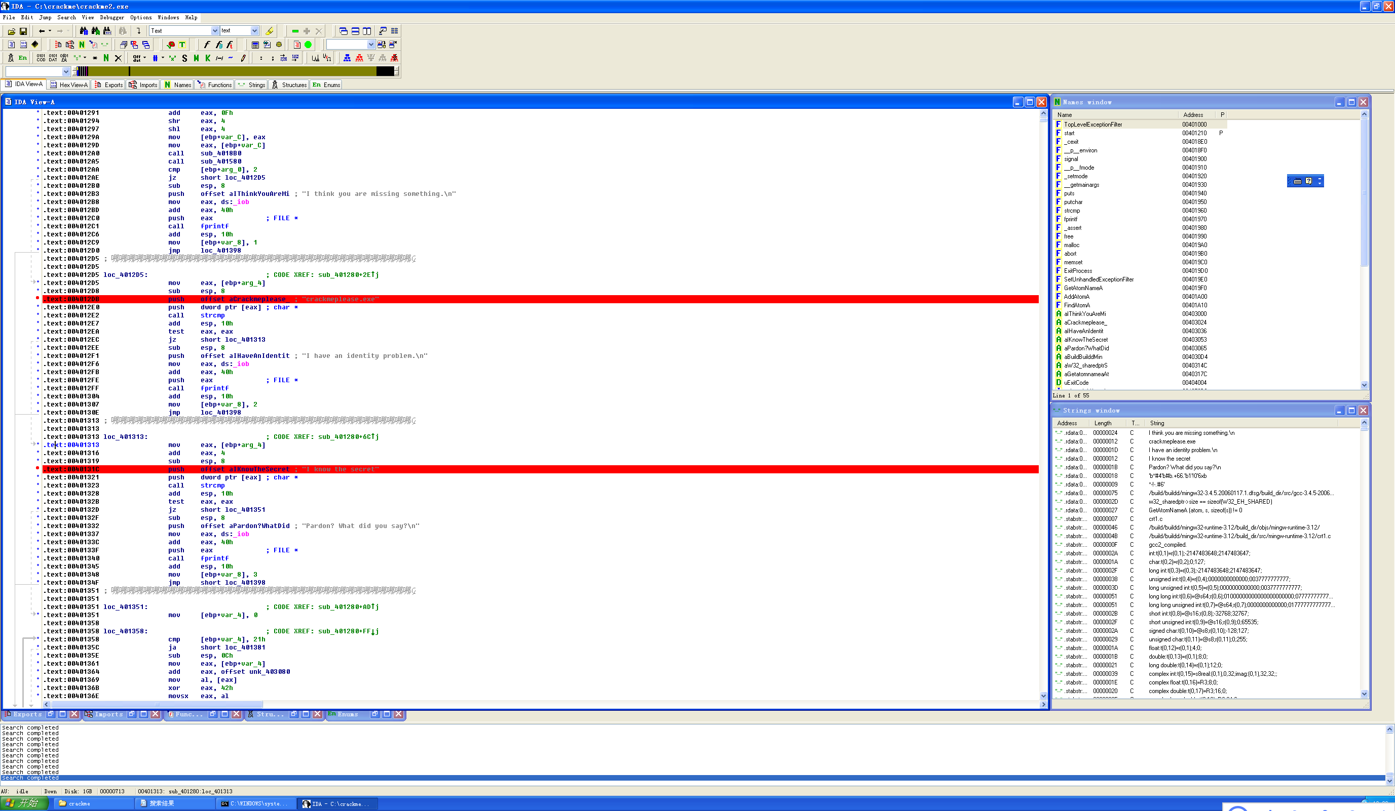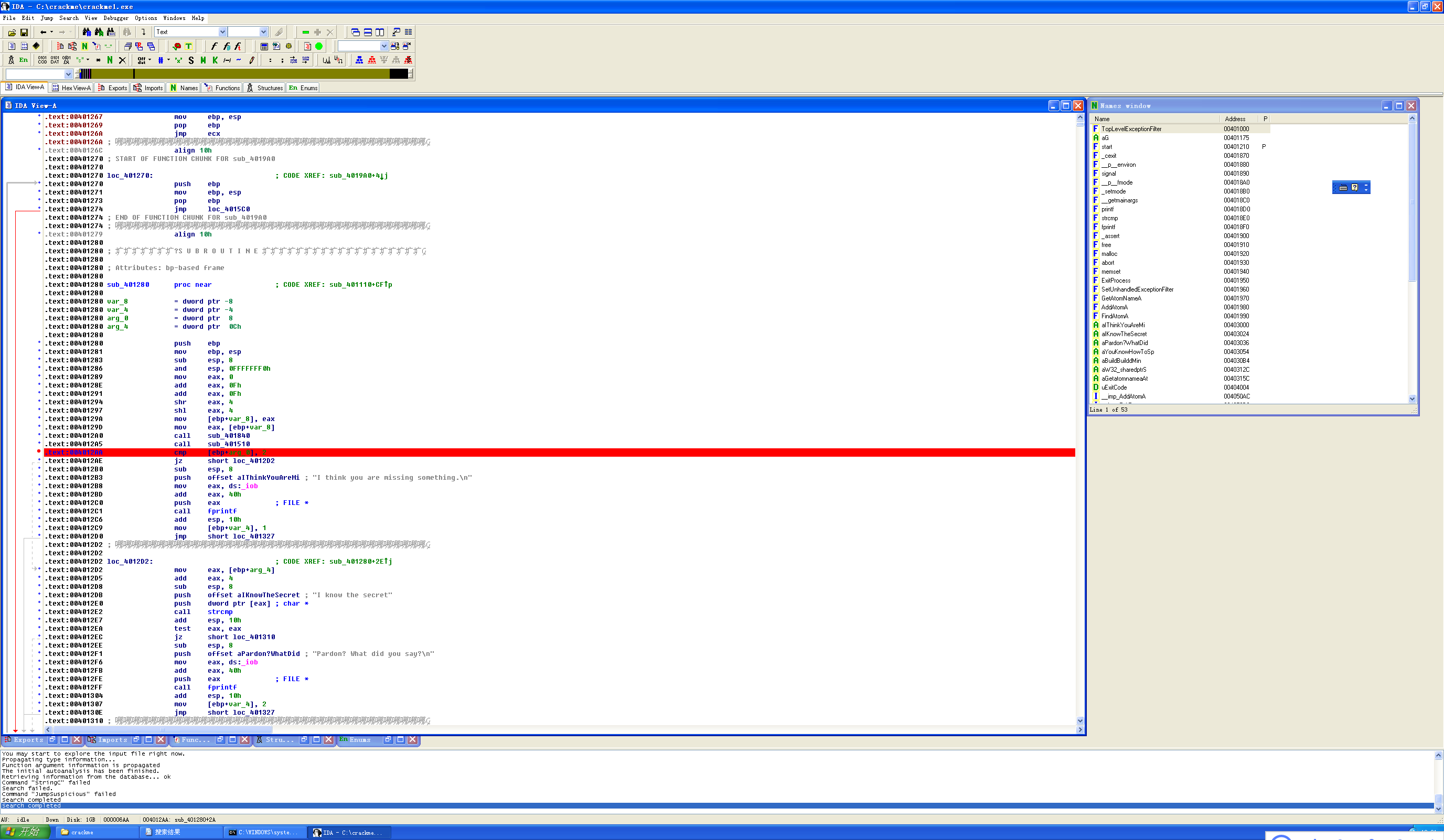 下面来看sub_401280,内容与上一个文件基本一致,大致可以判断出关键口令为I know the secret,只是从下图可以看到,代码逻辑中的程序名称改变了,变成了:crackmelpease.exe.因此需要对程序名称进行修改。
