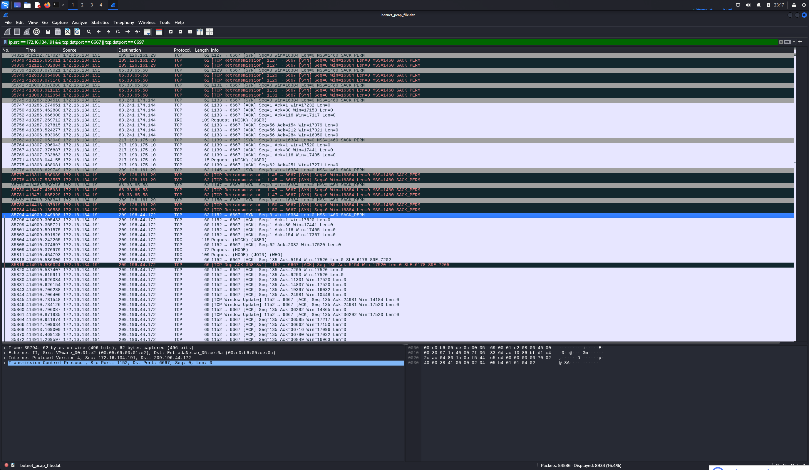 首先通过Wireshark打开数据文件botnet_pcap_file.dat,并设置过滤条件ip.src == 172.16.134.191 && tcp.dstport == 6667,可以找到所有与蜜罐主机进行通信的五个 IRC 服务器:分别为209.126.161.29、66.33.65.58、63.241.174.144、217.199.175.10、209.196.44.172