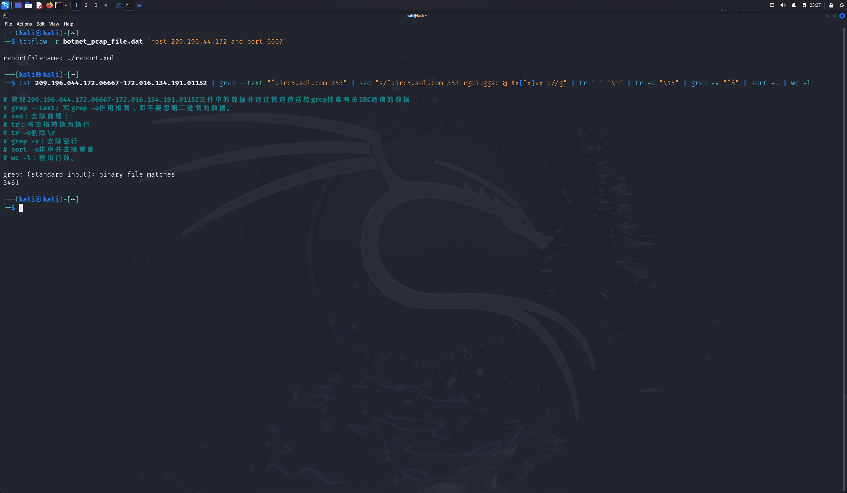 由于需要的是多少不同的主机访问了以209.196.44.172为服务器的僵尸网络,我们使用如下命令获取访问该服务器的主机数量: