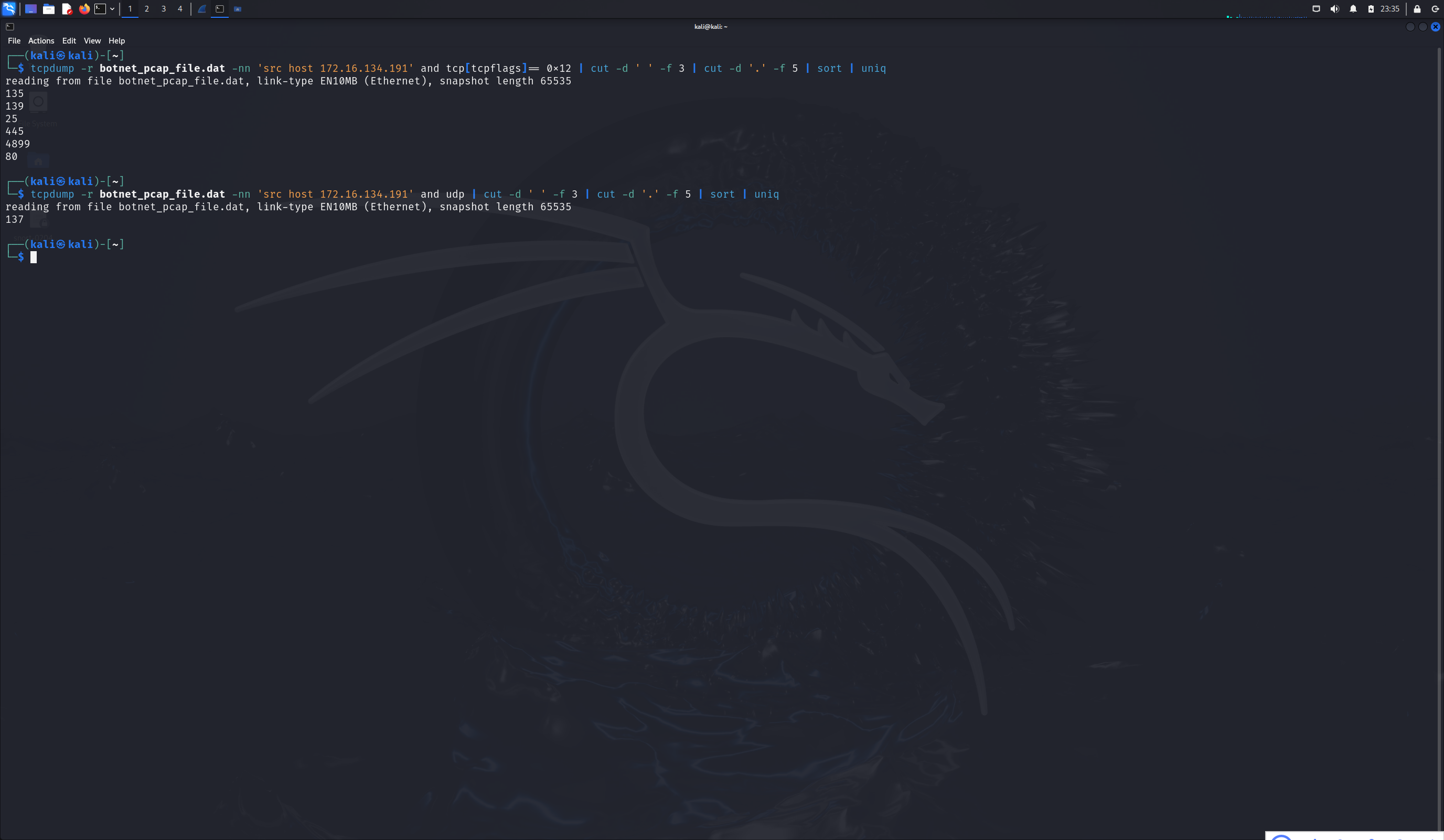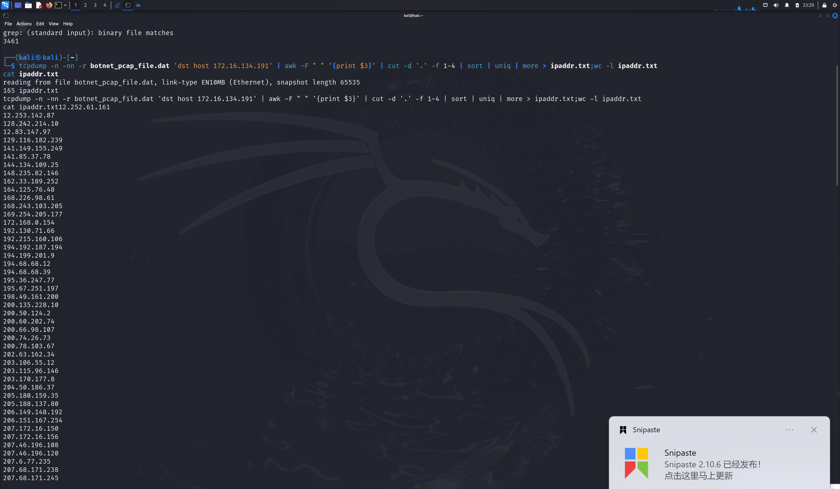 tcpdump -n -nn -r botnet_pcap_file.dat 'dst host 172.16.134.191' | awk -F " " '{print $3}' | cut -d '.' -f 1-4 | sort | uniq | more > ipaddr.txt;wc -l ipaddr.txt
