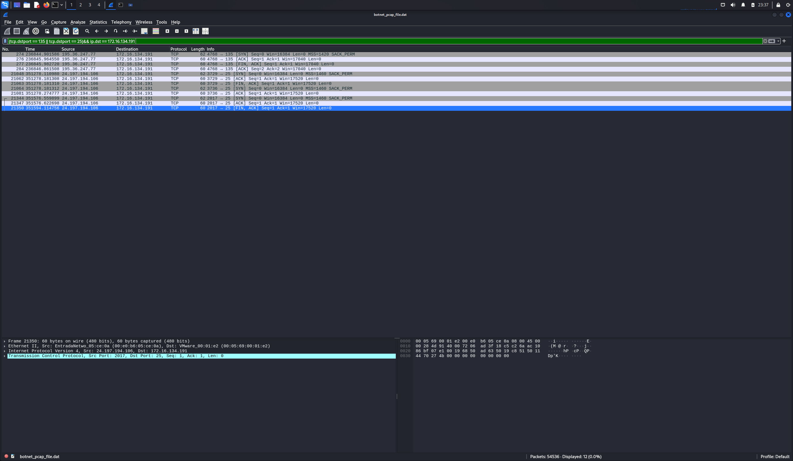 (tcp.dstport == 135 || tcp.dstport == 25)&& ip.dst == 172.16.134.191