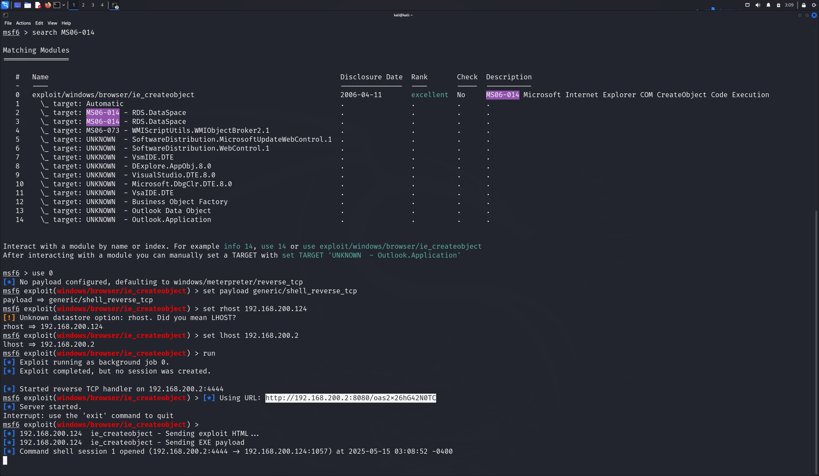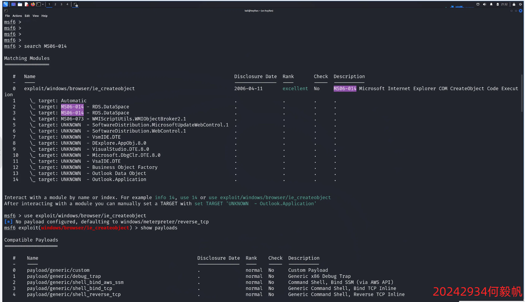 使用search MS06-014命令查看漏洞的相关信息,使用命令use exploit/windows/browser/ie_createobject选择漏洞,然后使用show payloads命令查看可用负载。